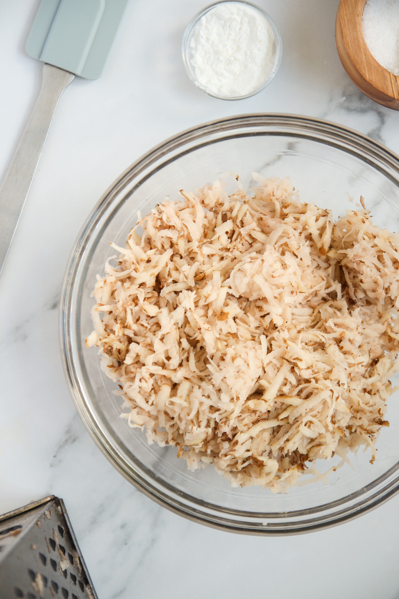 Add the shredded potato to a large mixing bowl. Sprinkle over the cornstarch, sea salt, and fresh black pepper. Using a baking spatula or wooden spoon, stir to coat. Add the olive oil and toss once more to coat.