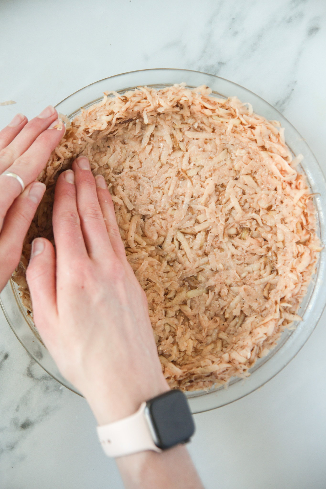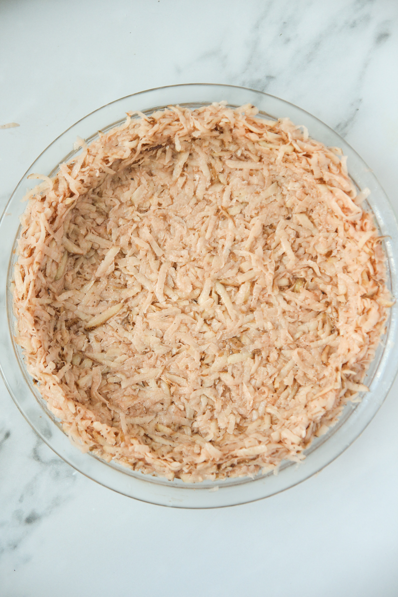 - Grease a 9-inch pie dish with some olive oil. Transfer the seasoned shredded potatoes to the greased dish. Using your hands, spread the potato in an even layer across the bottom of the pan, then work it up the sides to create a crust. You want to get the crust as even as you can so it bakes uniformly.