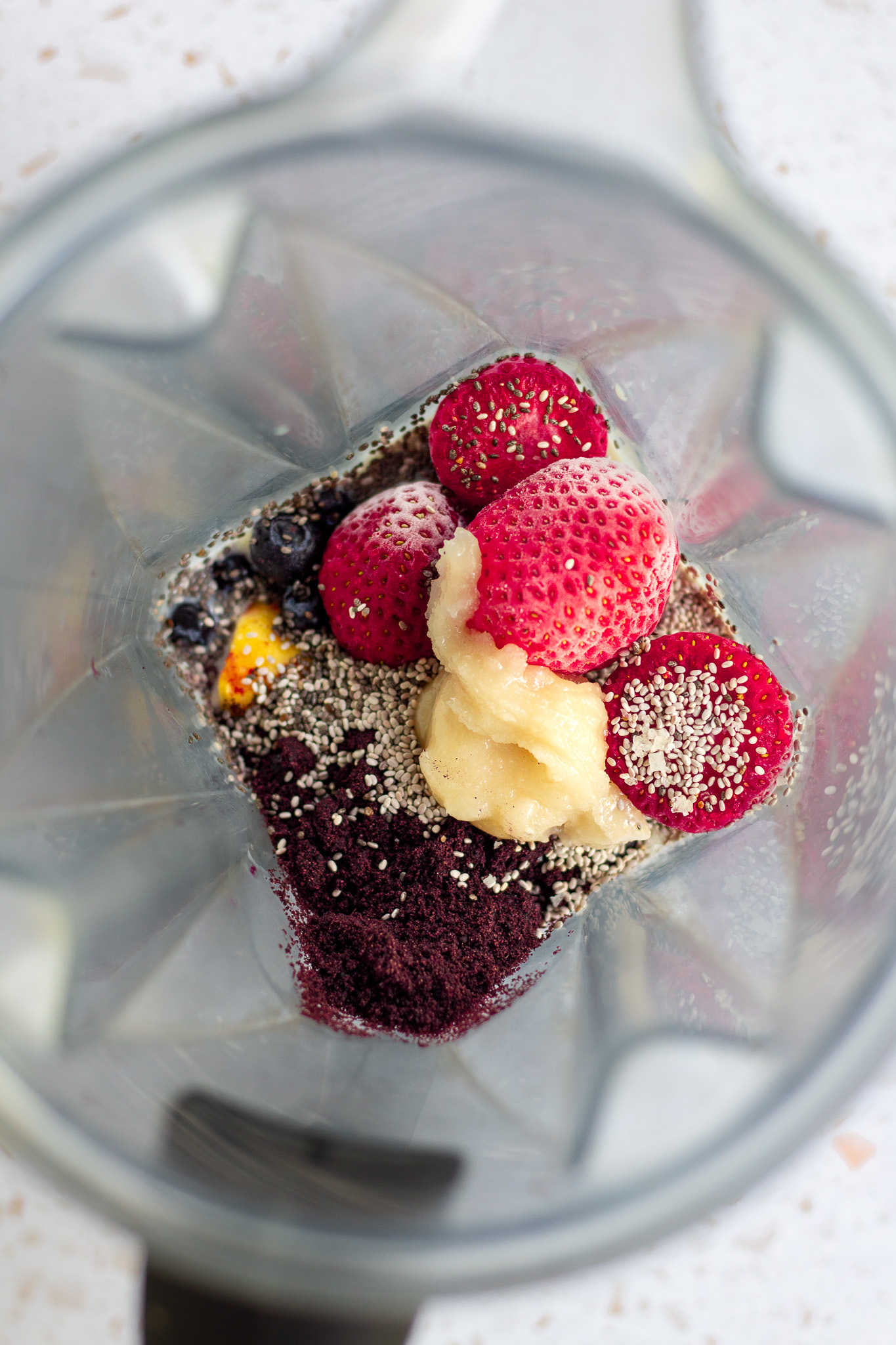 Add the non-dairy milk, frozen fruit, açai powder, chia seeds, honey, and a pinch of sea salt to a high speed blender. Blend on high until completely smooth, stopping to scrape down the sides of the blender as necessary.