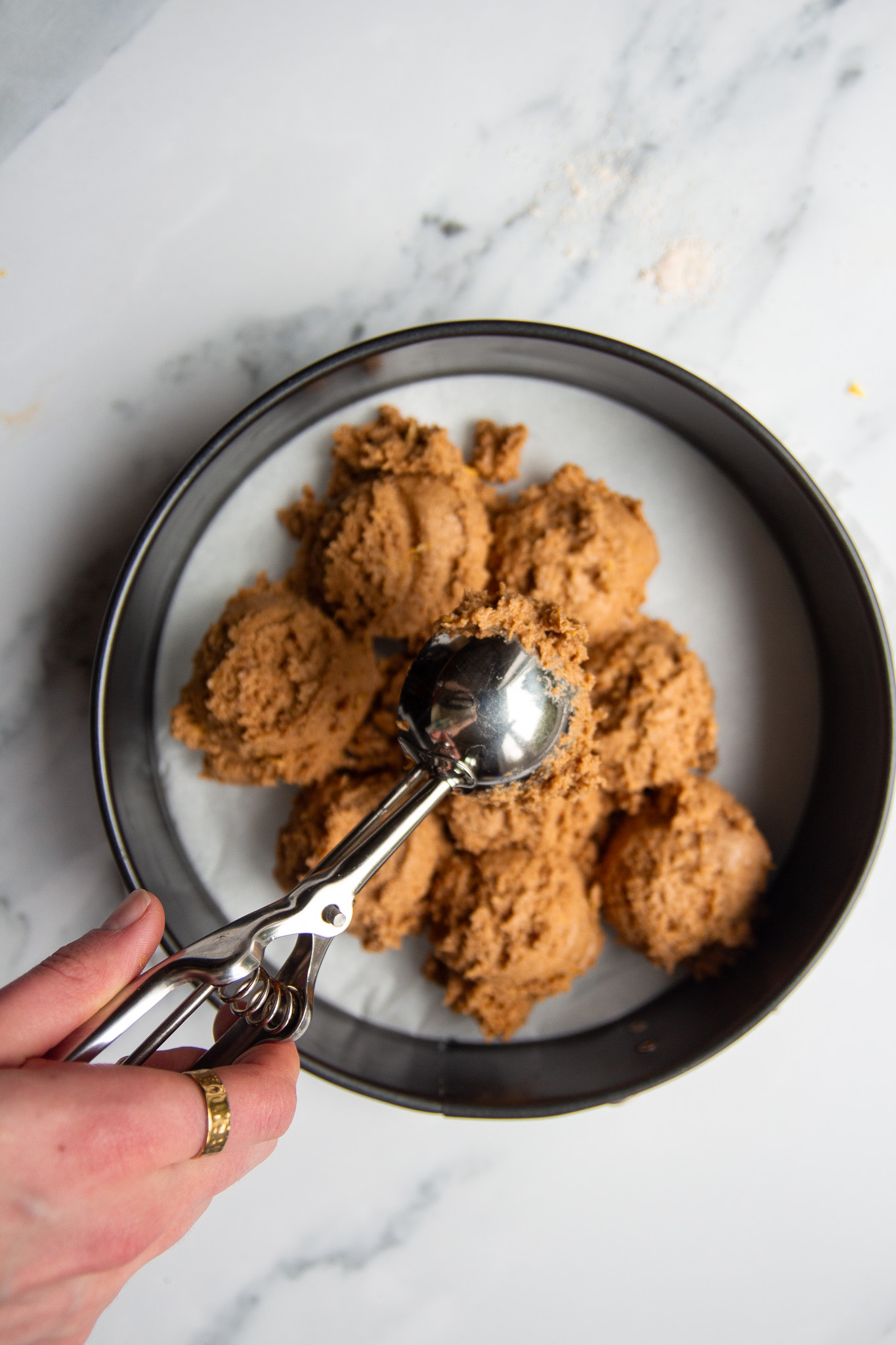 - Transfer the batter to the prepared springform pan. I like to use a large cookie scoop to do this, but this is not necessary. Smooth out the batter so it is evenly spread across the pan.