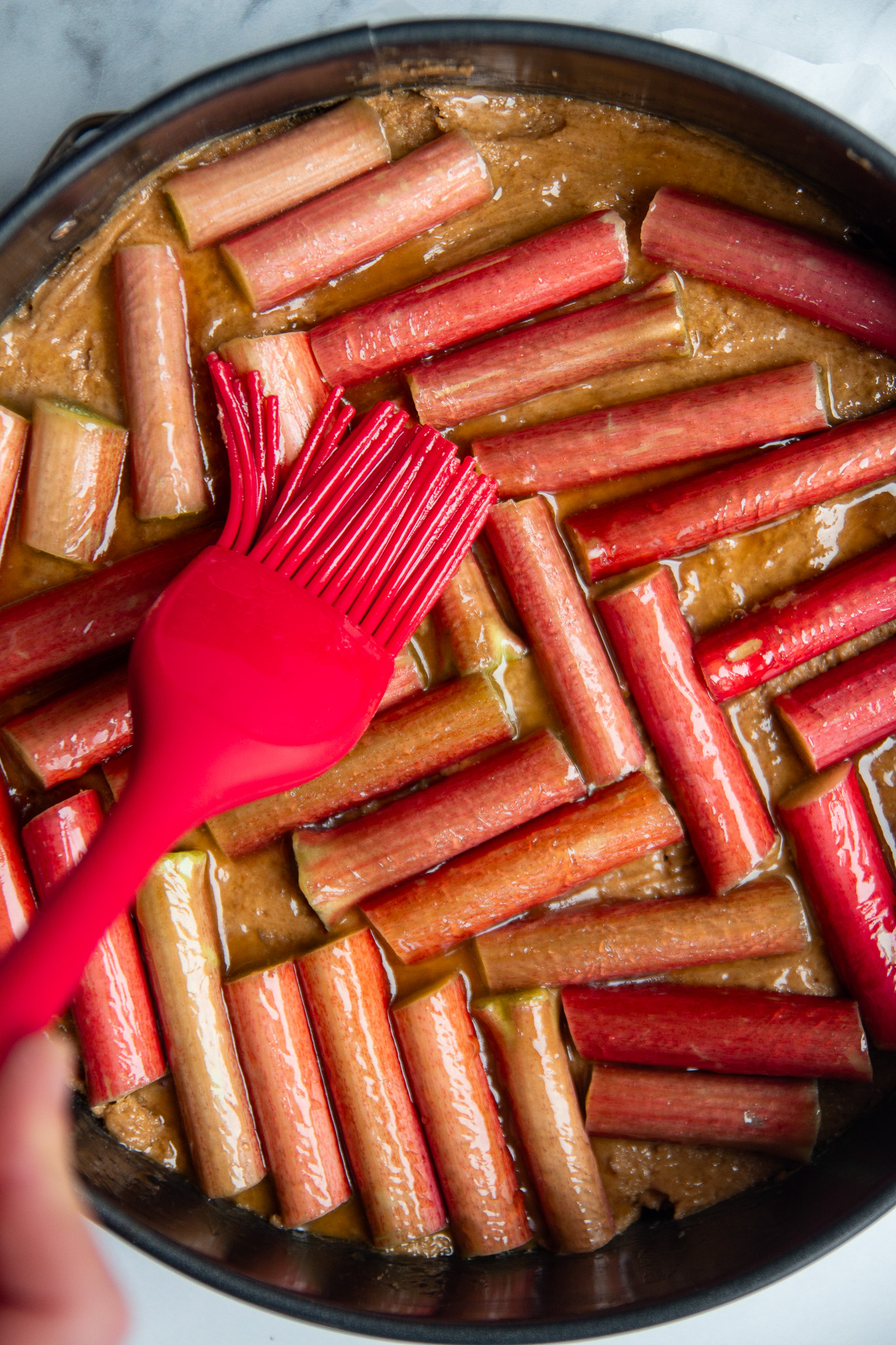 - Slice the rhubarb stalks into pieces that are approximately 2 inches long and place on top of the cake batter. I did a bit of a chevron pattern, but you can do any placement you like. Gently press the rhubarb into the batter.
