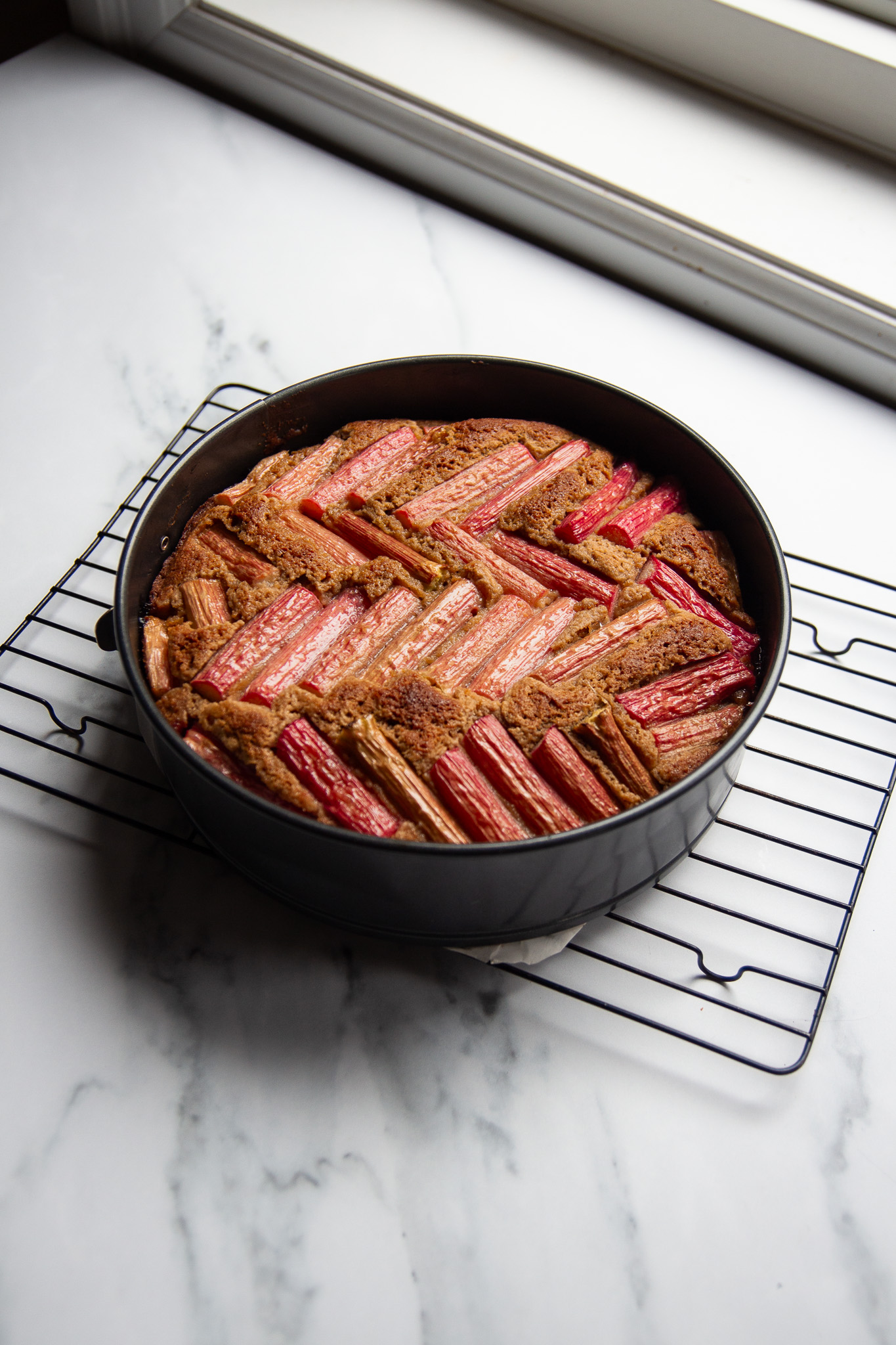 Slice the stalks of rhubarb into pieces that are approximately two inches long. Arrange the rhubarb on the top of the cake, pressing the pieces gently into the batter. I created a chevron pattern, but you can create any pattern you would like.