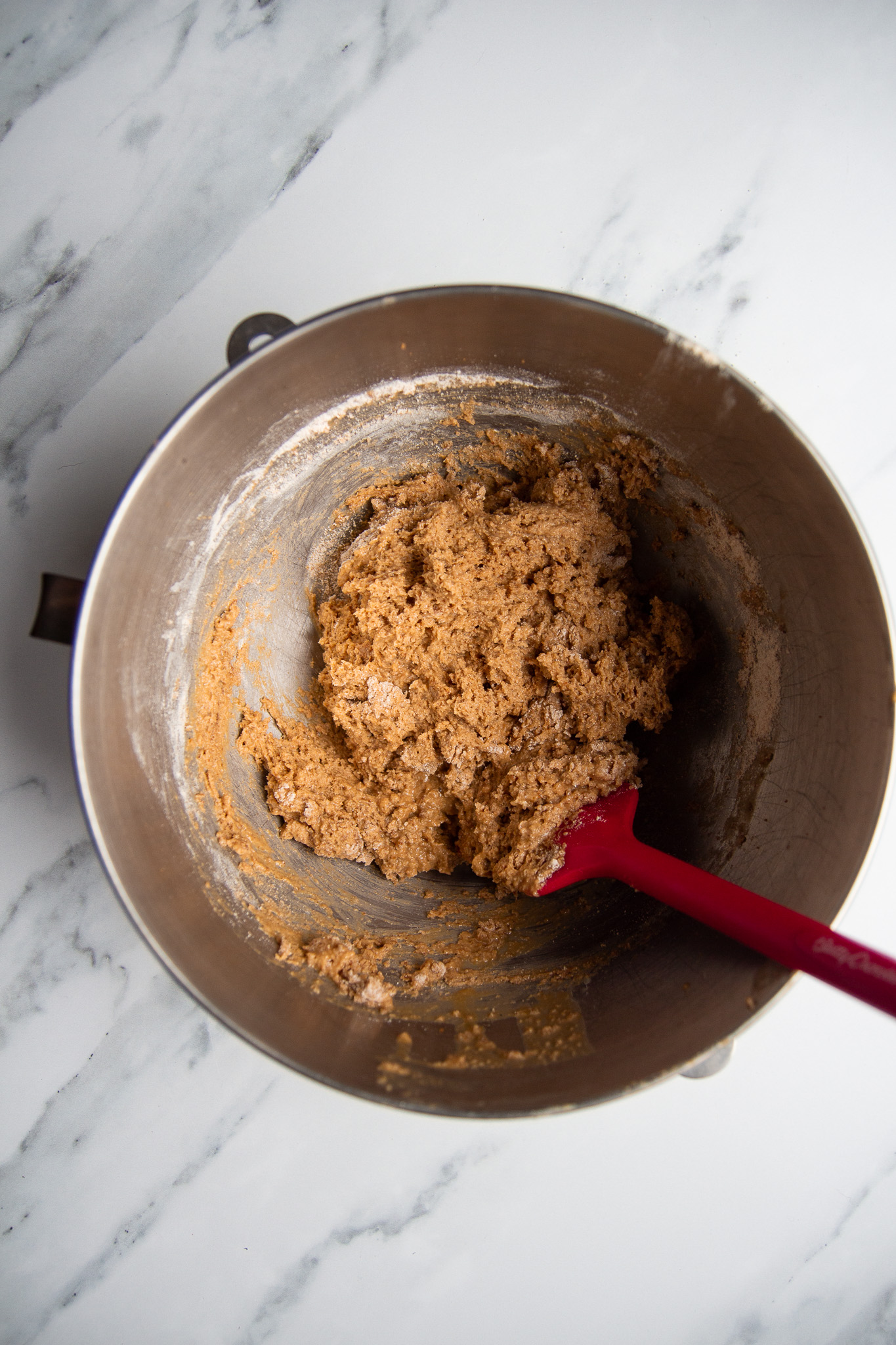 - Pour the dry ingredients into the wet and fold in using a baking spatula. Mix until no dry bits of flour remain.
