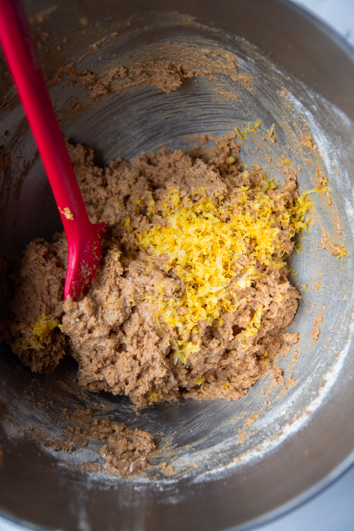 - Use a baking spatula to fold the vanilla extract, almond extract, Greek yogurt, and lemon zest into the wet mixture.