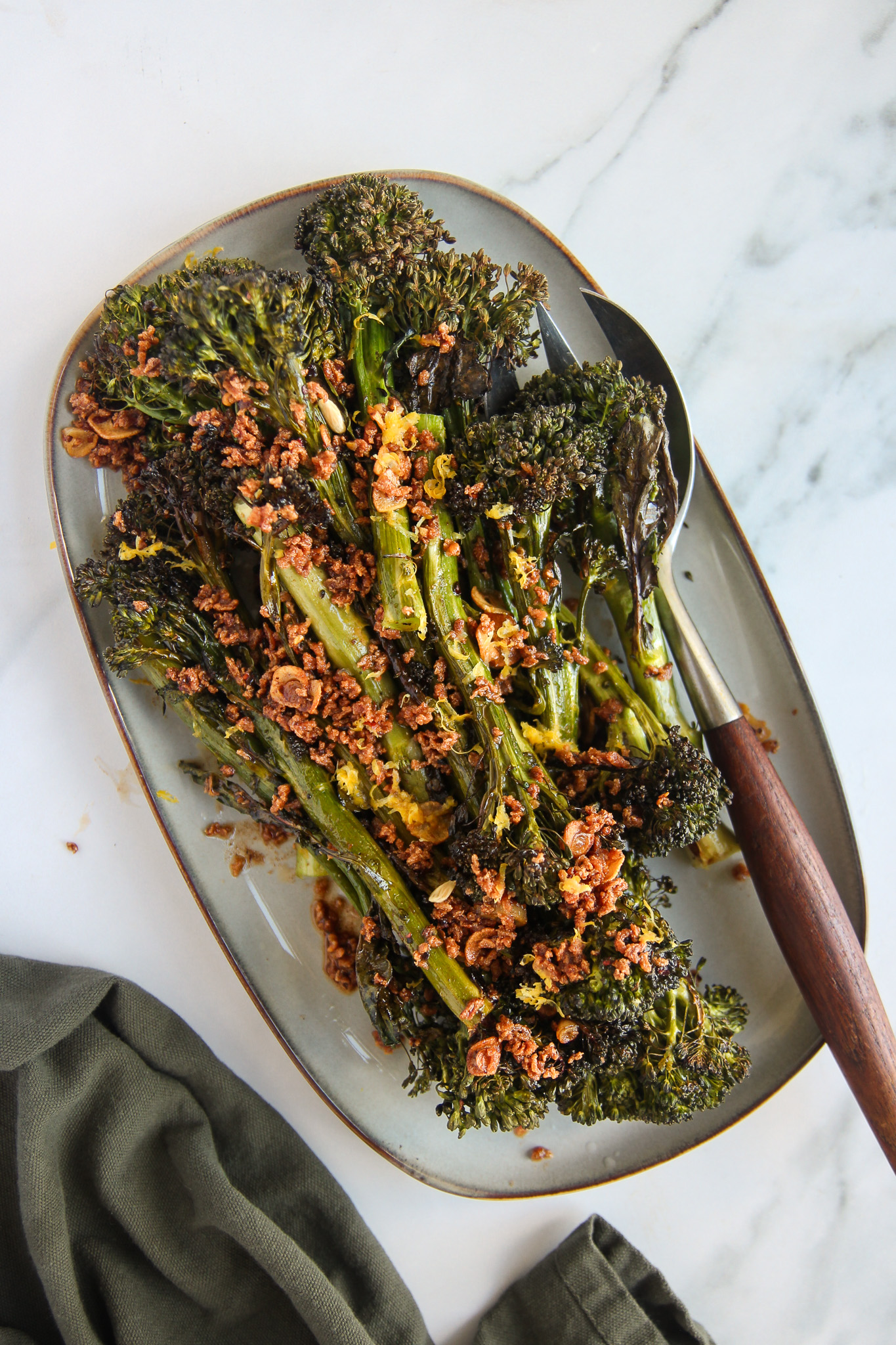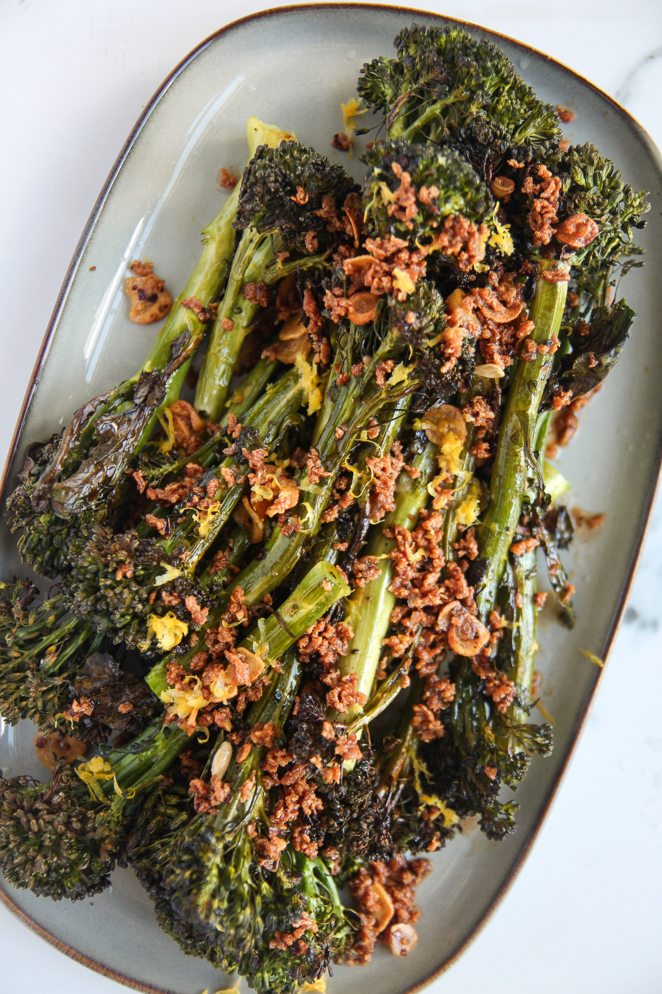 - Transfer the roasted broccolini to a serving platter. Pour over the brown butter chili crisp. Grate fresh lemon zest over the broccolini and squeeze over some fresh lemon juice.