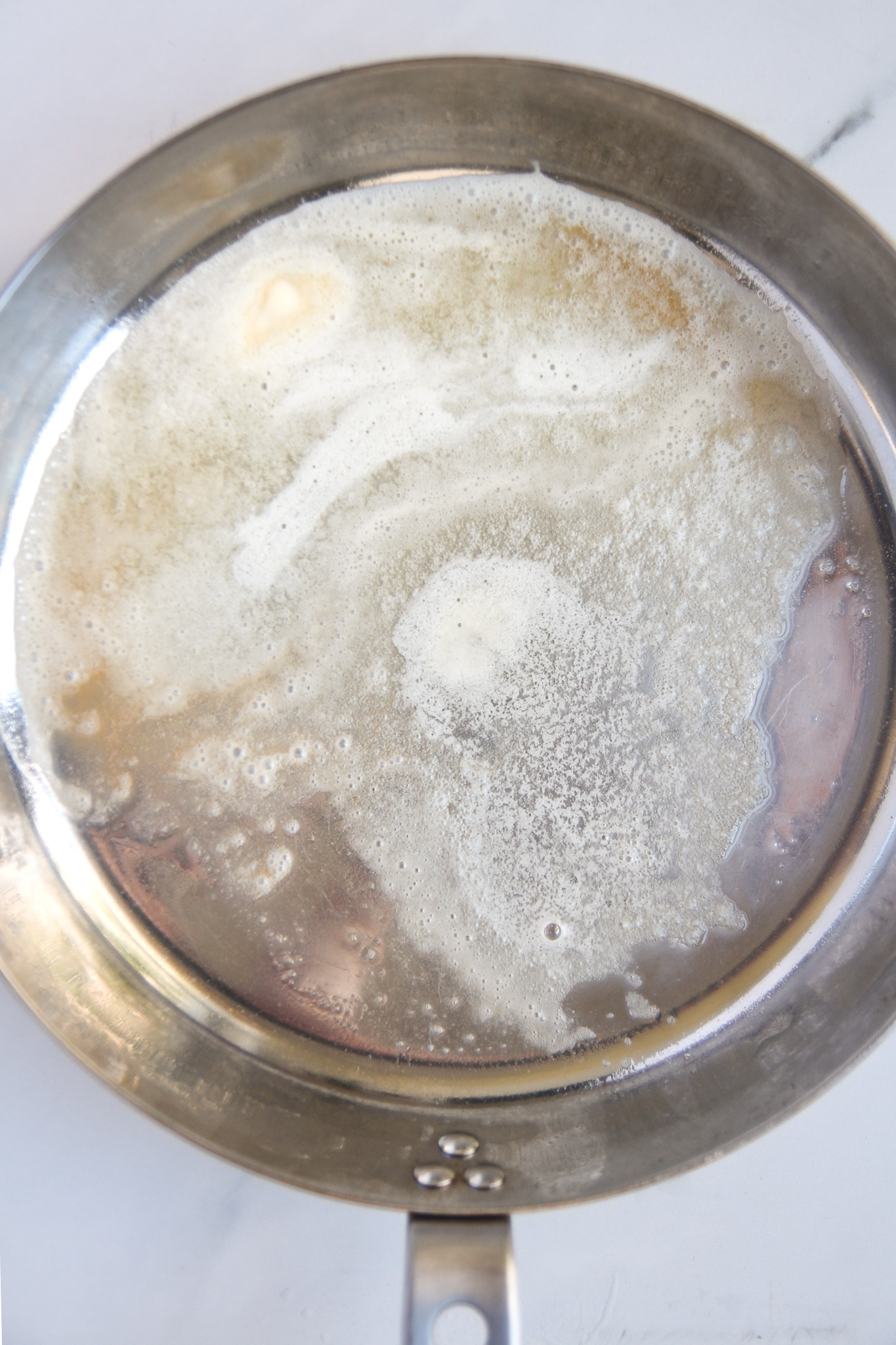 - While the broccolini is roasting, prepare the brown butter chili crisp. Preheat a frying pan over medium-low heat. I like to use a stainless steel pan for this.