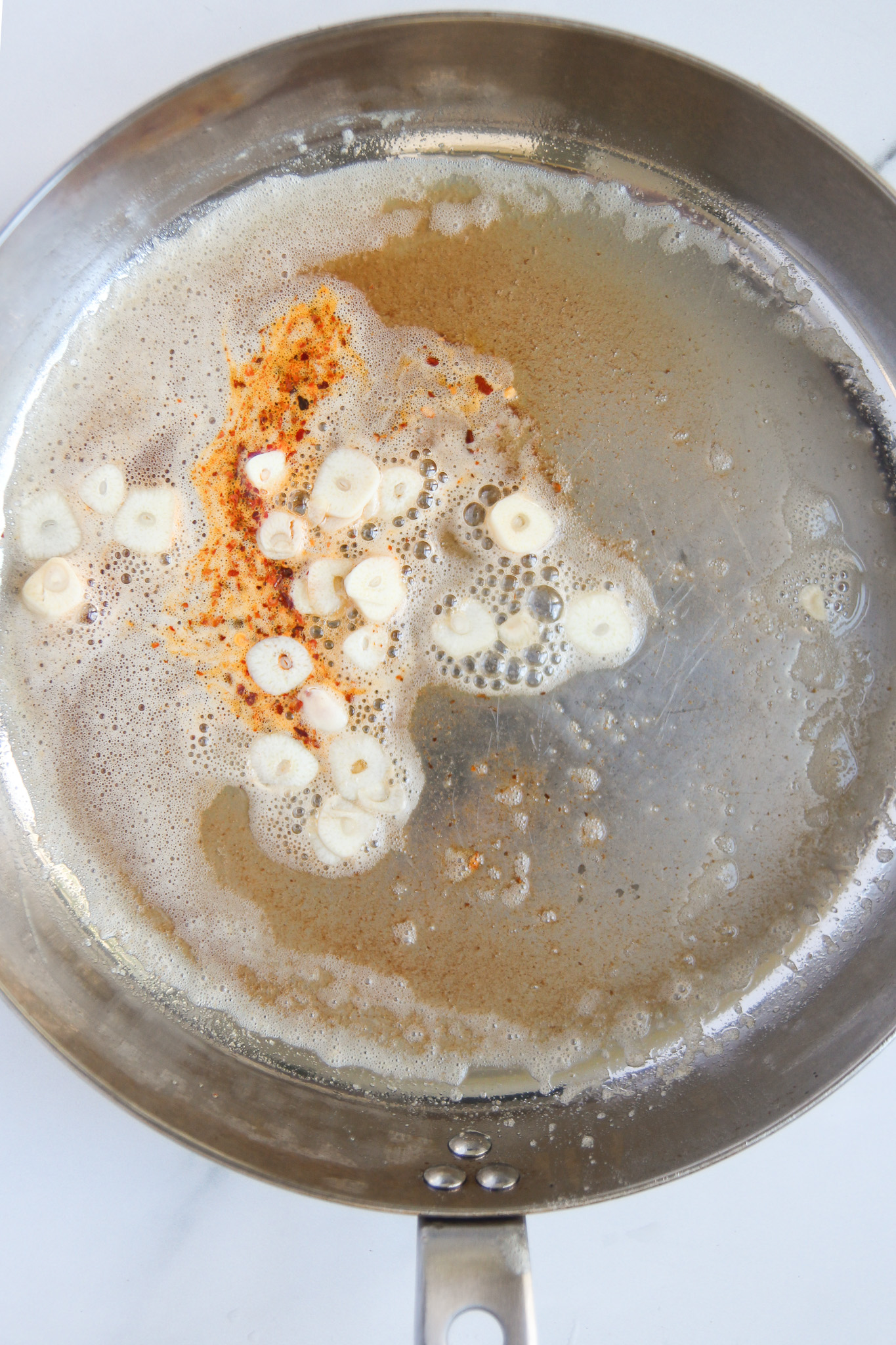 - Once the pan is warm, add the butter. Cook, stirring occasionally, until the butter begins to brown slightly. This should take about 1 minute. Add the chili flakes and thinly sliced garlic. Cook, stirring constantly, for about 1 minute.