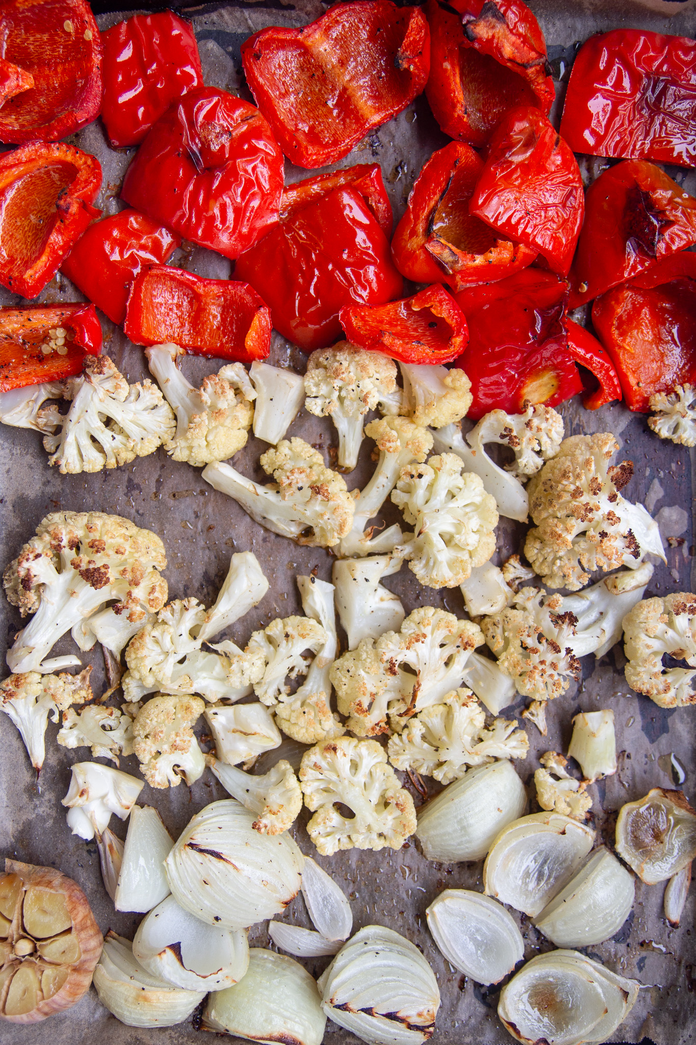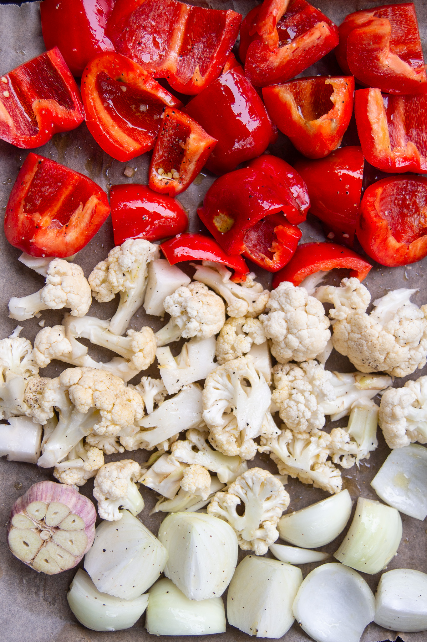 Prepare the vegetables by chopping the cauliflower into florets, slicing the peppers into large chunks, slicing the onions into large wedges, and slicing off the top of the bulb of garlic to expose the individual cloves.