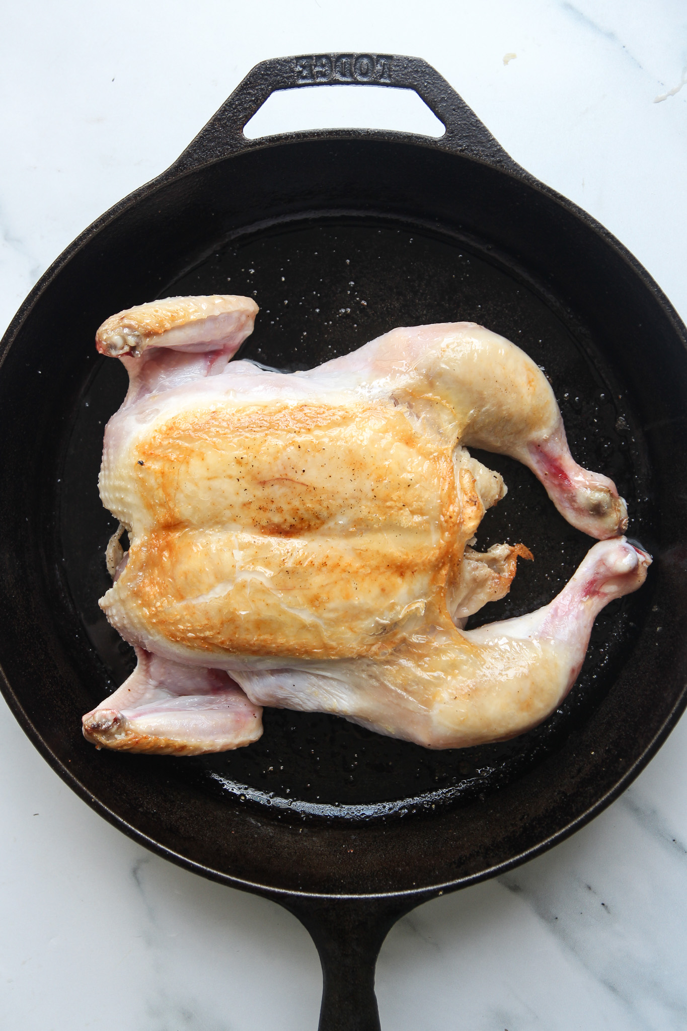 Heat a large cast iron pan over medium heat. Once it is hot, add a tablespoon of olive oil and swirl the pan around to coat. Place the chicken in the hot pan breast-side-down. Sear for 5 minutes. Flip the chicken and sear the back for a further 4 to 5 minutes. Transfer the chicken to a plate and set aside.
