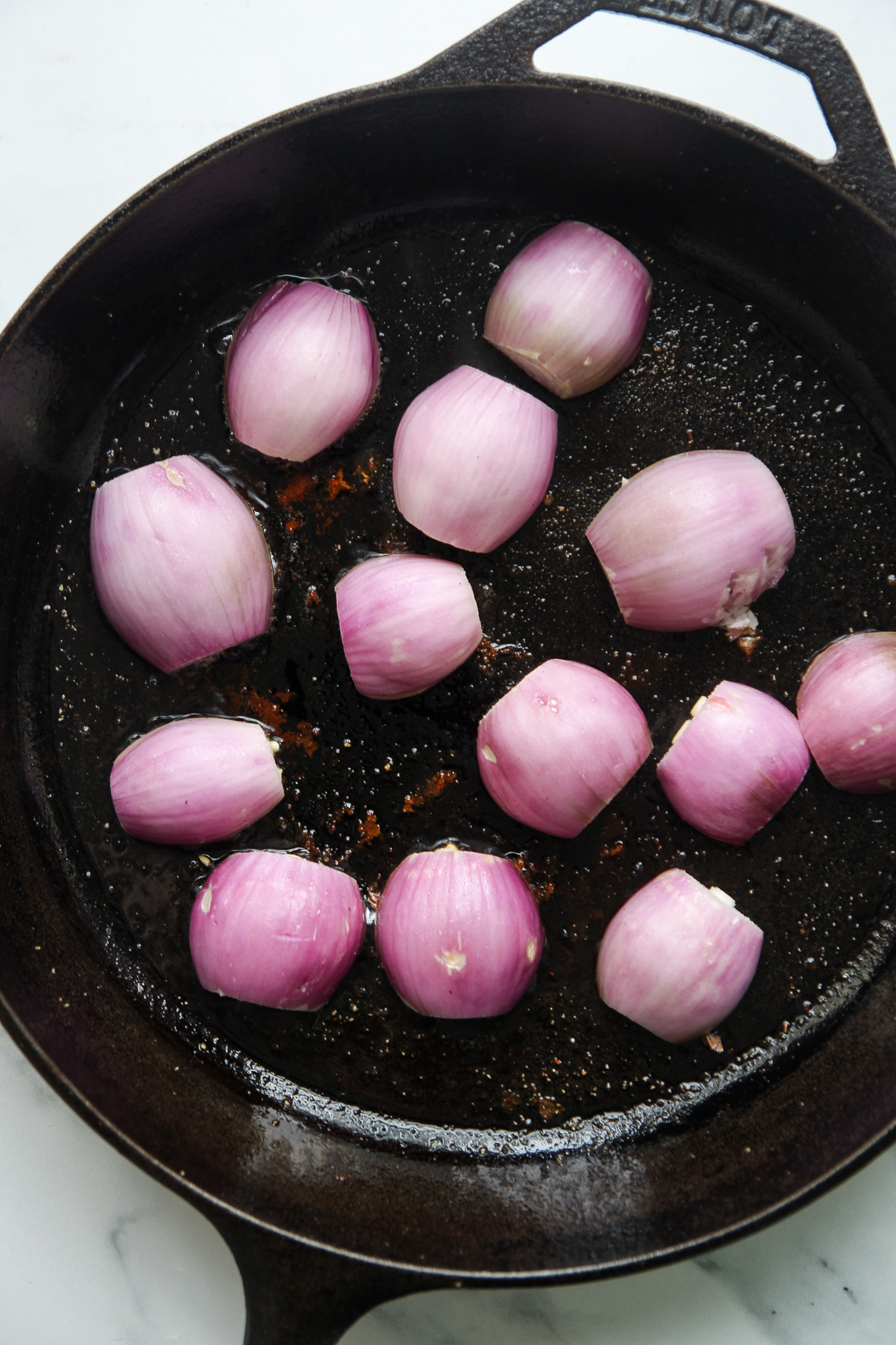 - Add the halved shallots to the pan cut-side-down. Sear for 4 to 5 minutes, or until the cut sides of the shallots are golden brown.