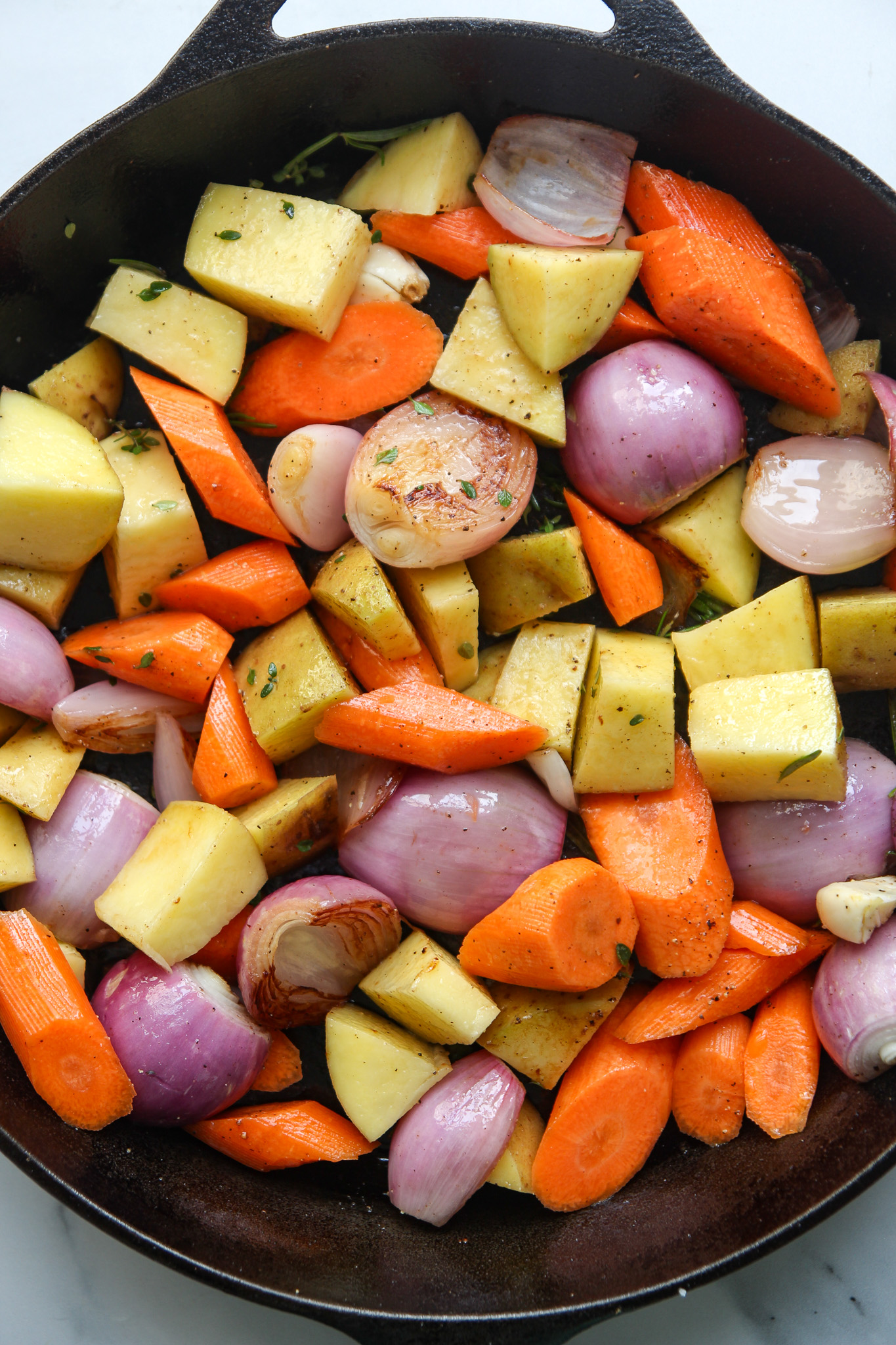 - Add the carrots, potatoes, fresh thyme, and fresh rosemary to the pan with a drizzle of olive oil. Season with salt and fresh black pepper, then toss the vegetables well to coat. Place the seared chicken back into the pan on top of the vegetables.