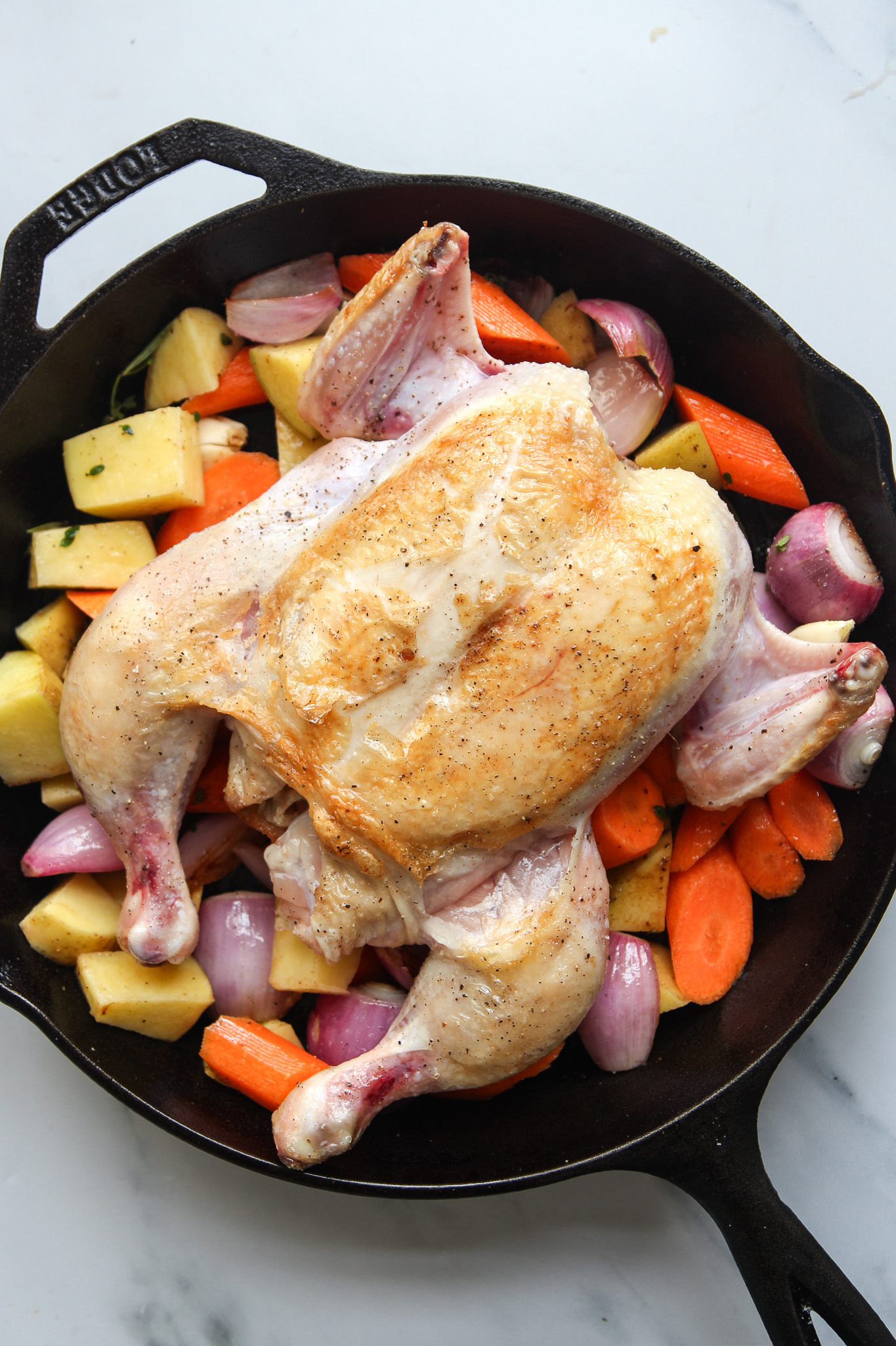 - Serve the chicken and roasted root vegetables warm with the buttery pan sauce.