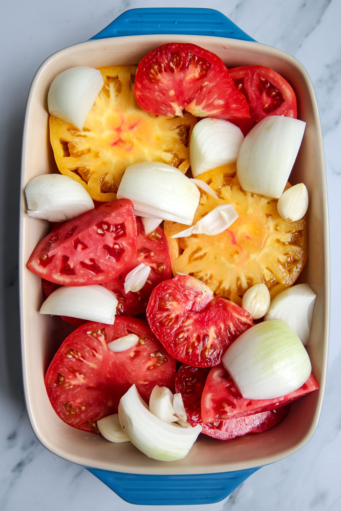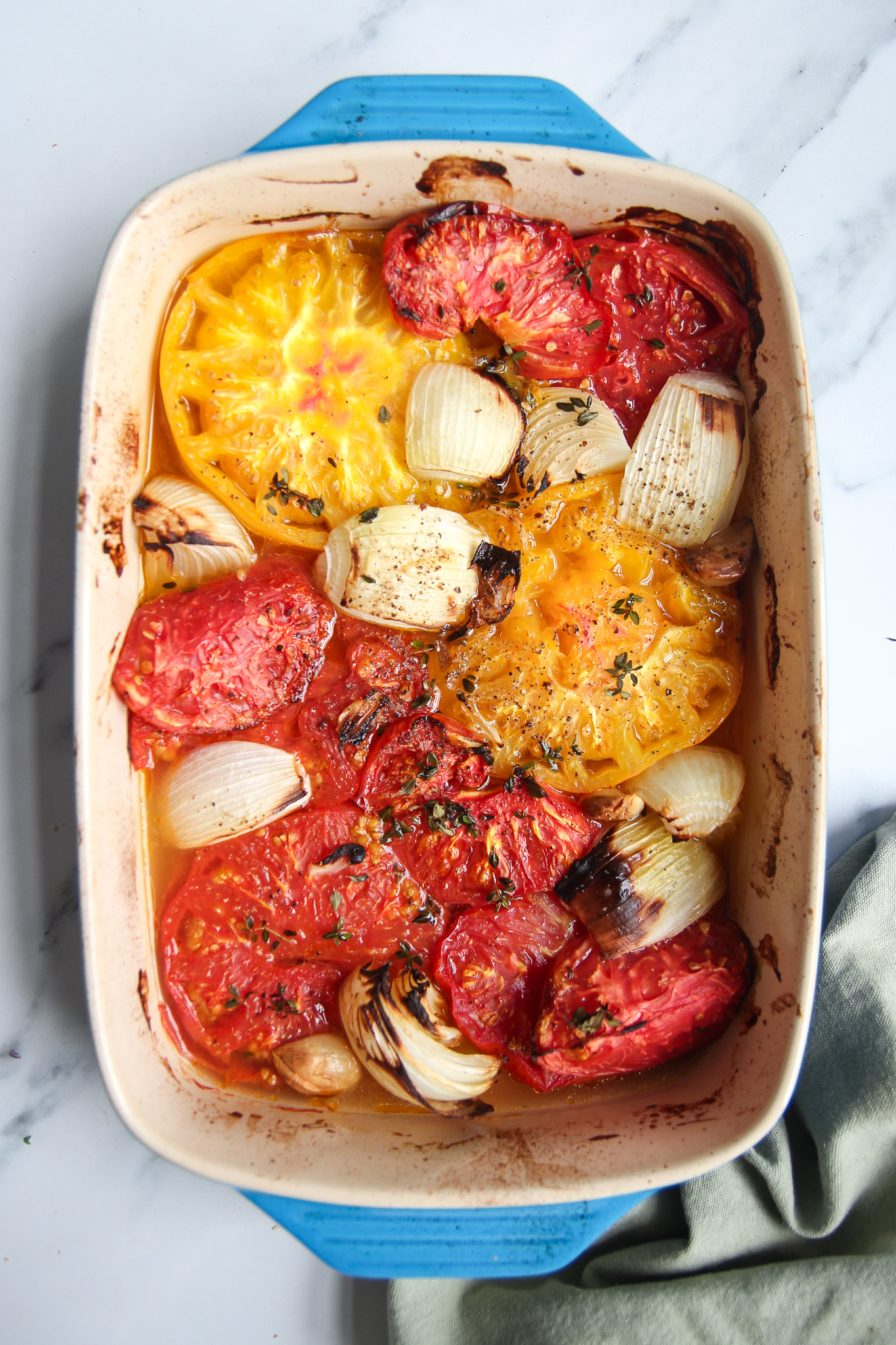 Transfer the tomatoes, onion, and whole garlic cloves to a 9 x 13 inch casserole dish. Alternatively, you can use a large rimmed baking sheet, but a casserole dish works best. Sprinkle over the thyme leaves, season with salt and pepper, then drizzle in the olive oil. Gently rub the olive oil and seasonings all over the vegetables.