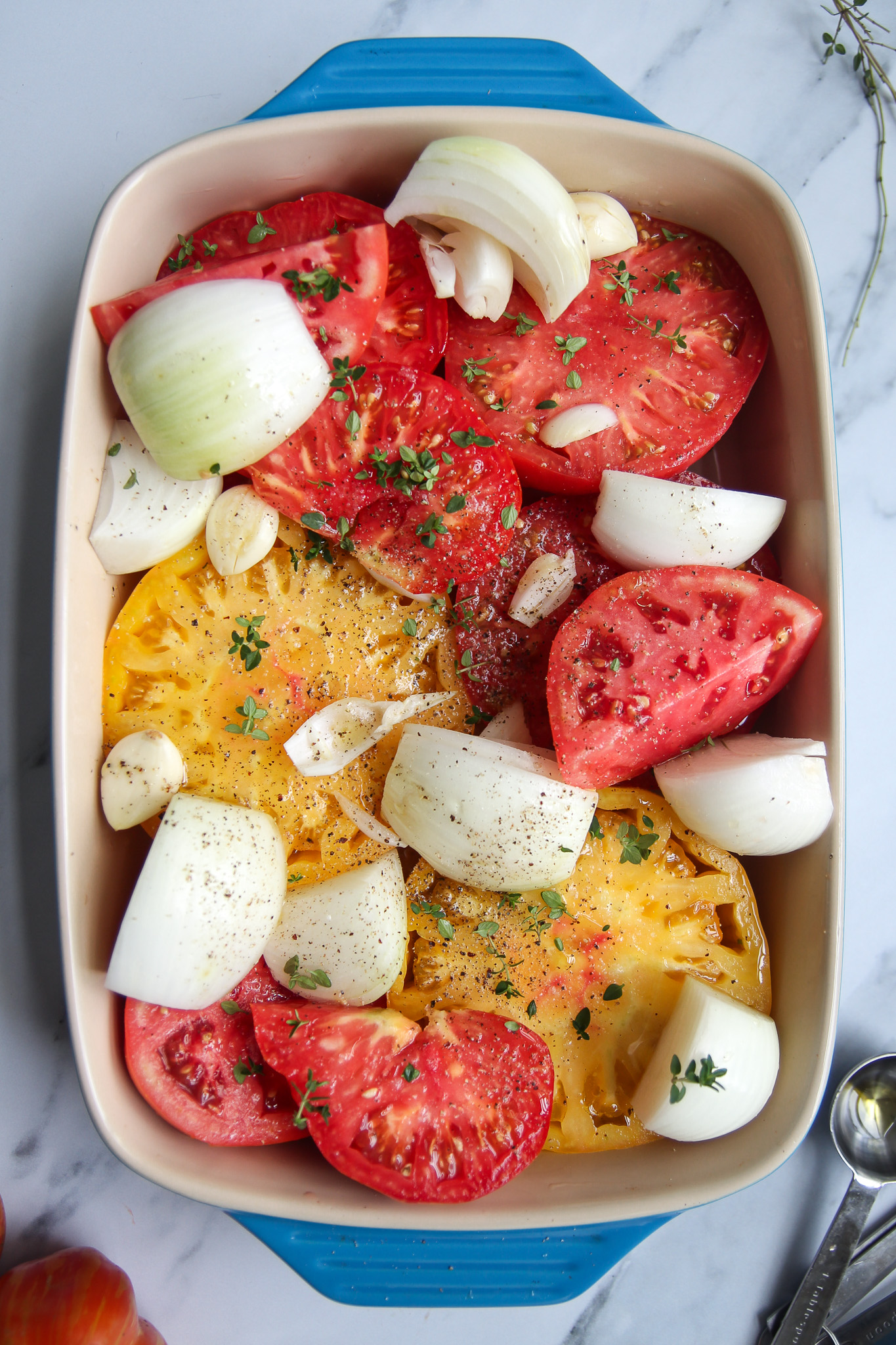 - Transfer the tomatoes, onion, and whole garlic cloves to a 9 x 13 inch casserole dish. Alternatively, you can use a large rimmed baking sheet, but a casserole dish works best. Sprinkle over the fresh thyme leaves, season with salt and pepper, then drizzle in the olive oil. Gently rub the olive oil and seasonings all over the vegetables.