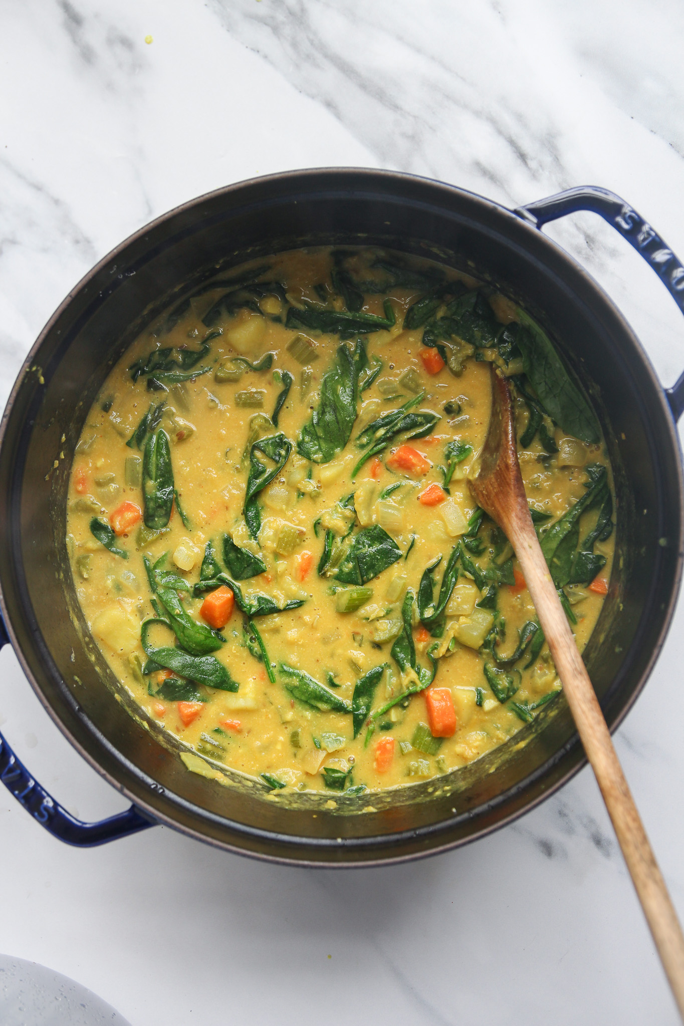 After 20 minutes, add the handfuls of spinach. Cook for another minute or two, stirring the spinach into the soup until it wilts. Taste the soup and adjust the seasoning as needed.