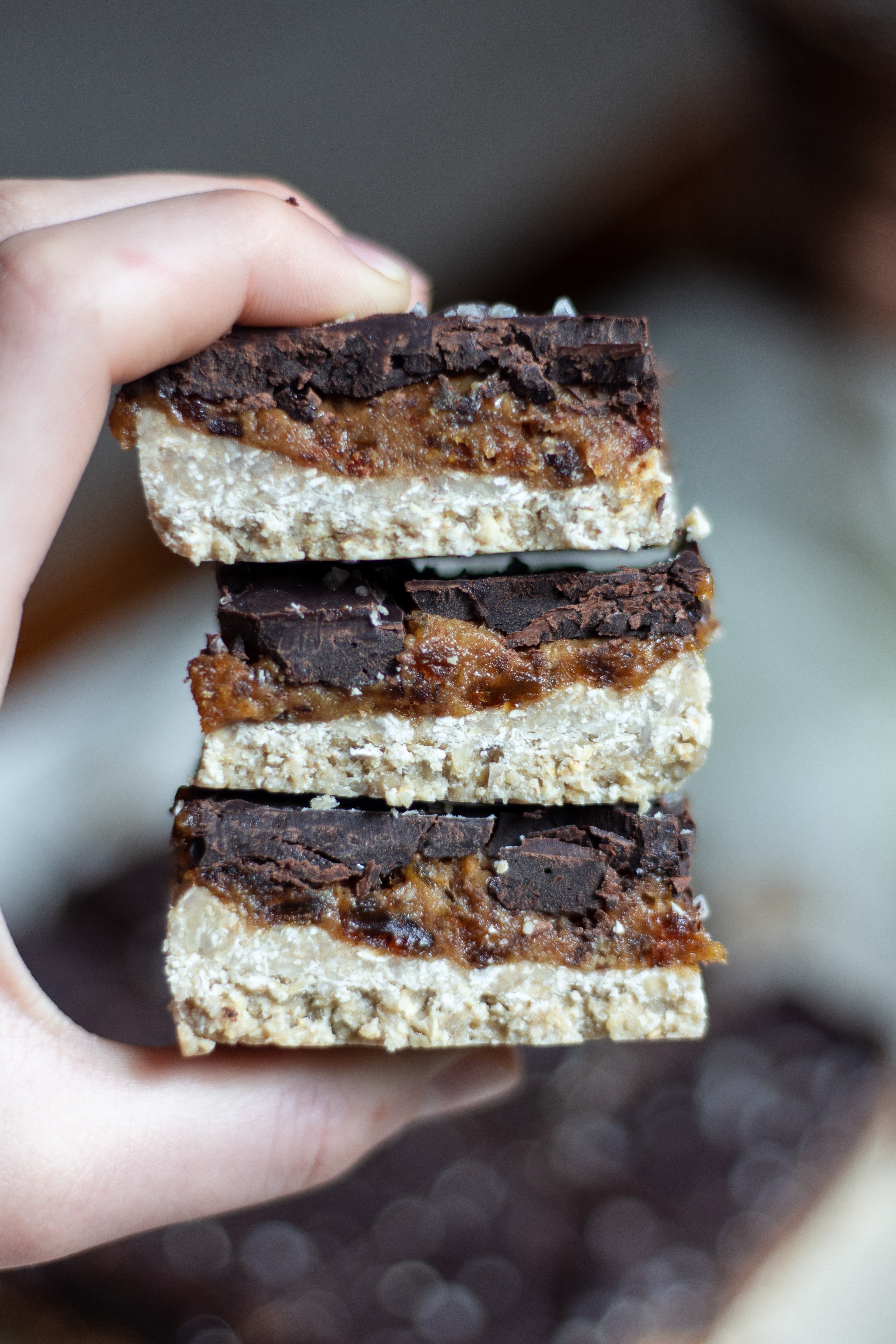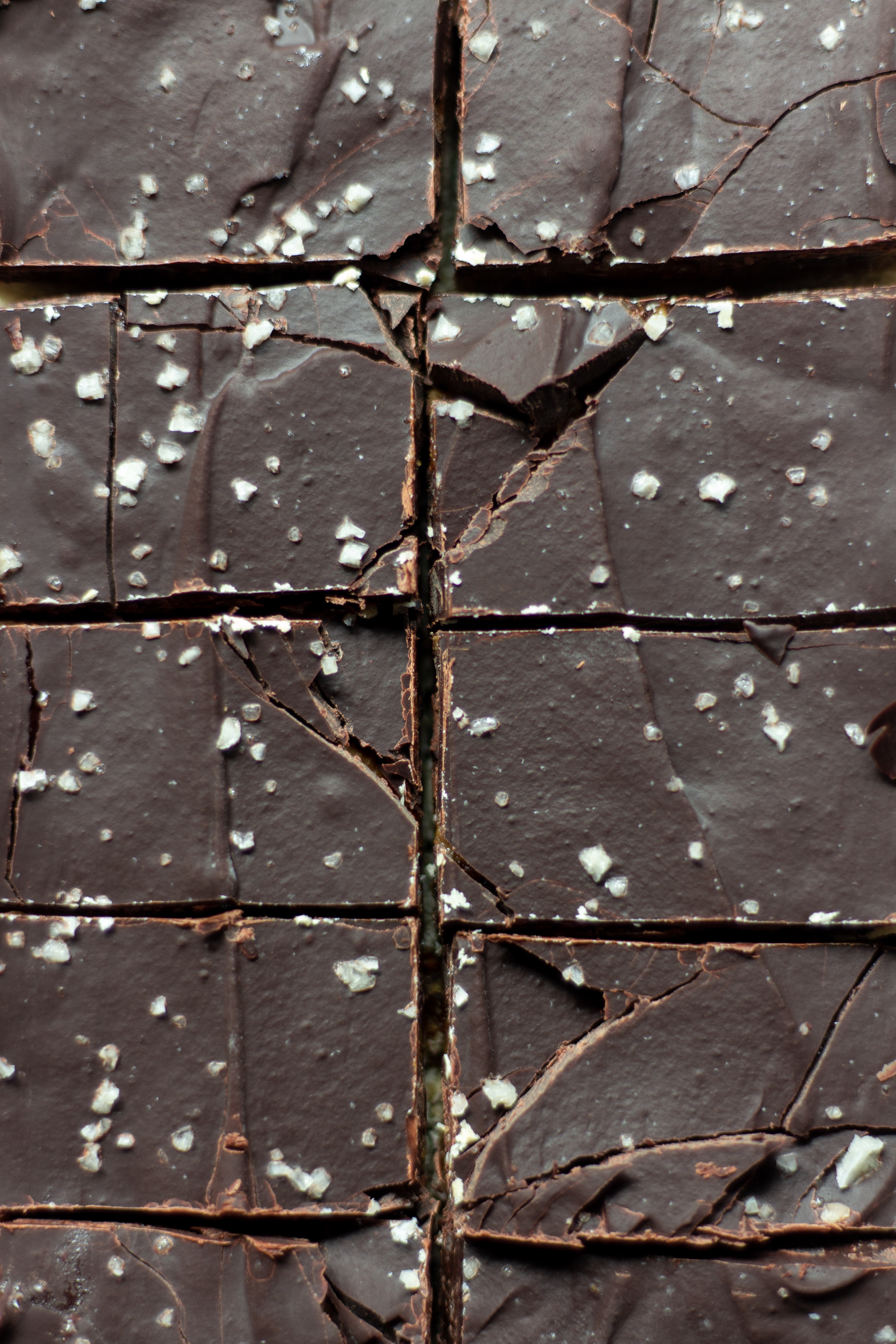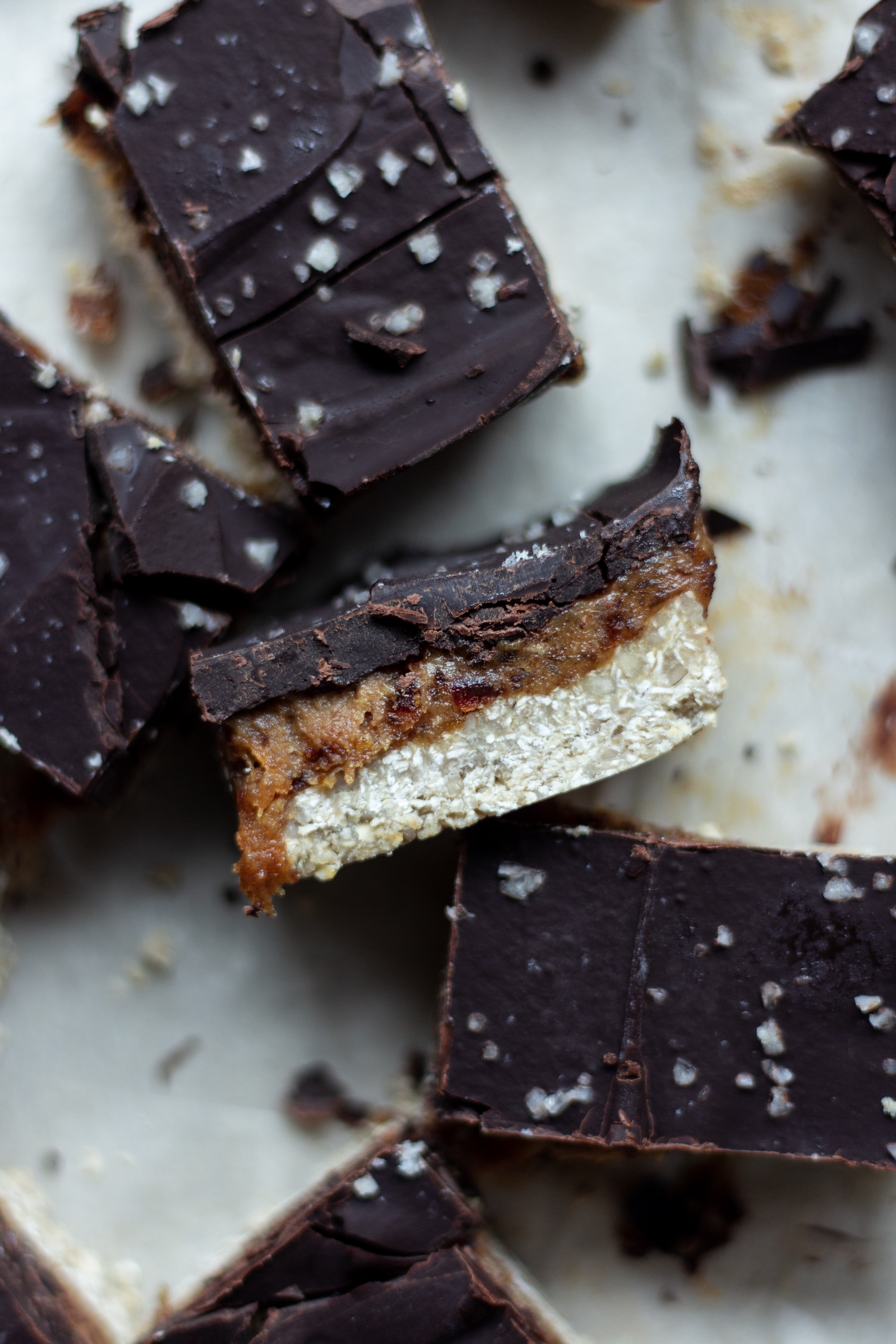 - Melt the dark chocolate over a double broiler. Spread the melted chocolate over the caramel layer, sprinkle with sea salt and then return to the freezer for a final freeze.