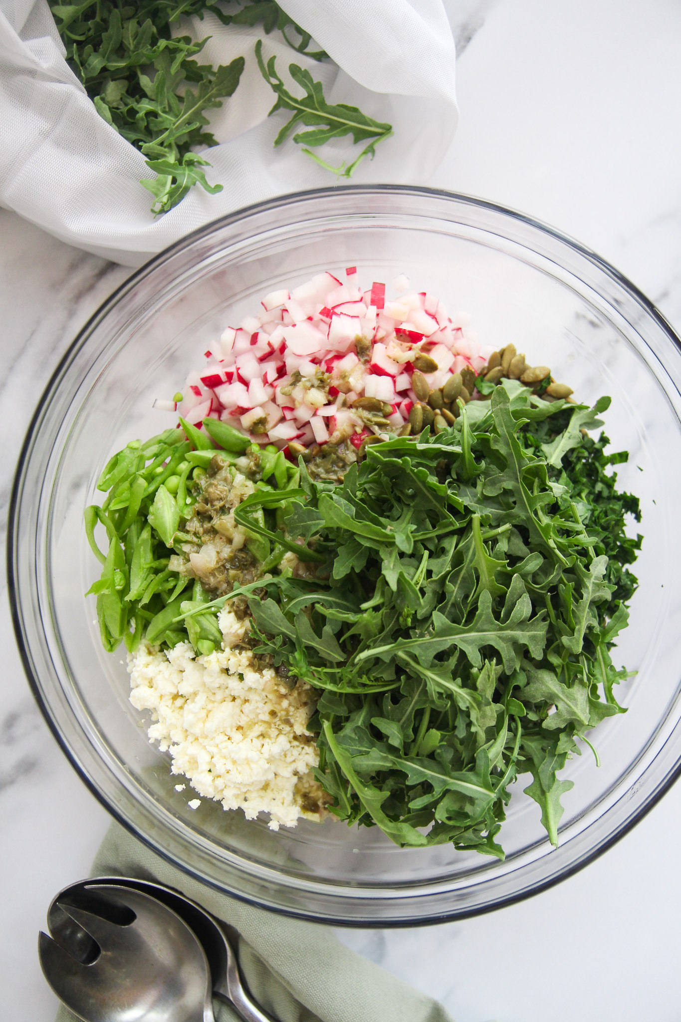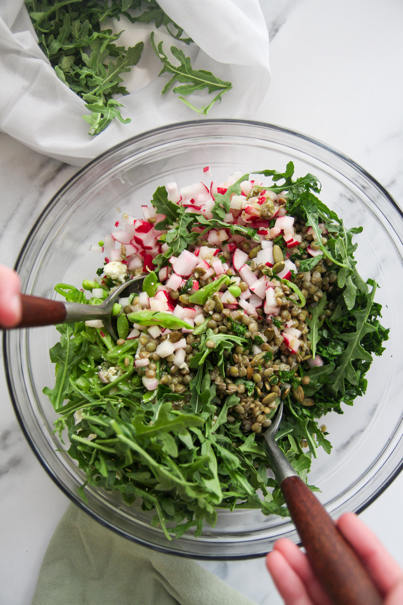 - To a large salad bowl, add the cooked lentils, cubed radishes, sliced snap peas, feta cheese, pumpkin seeds, parsley, and arugula.