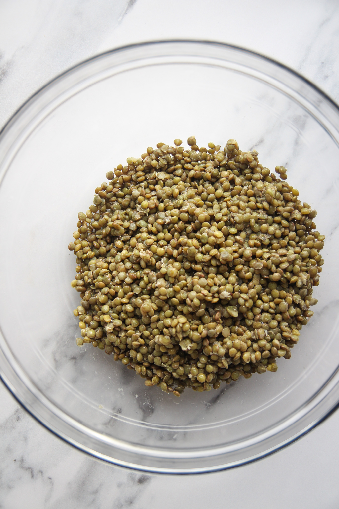 Add the drained and rinsed cooked lentils to a large salad bowl. Set aside while you prepare the dressing.