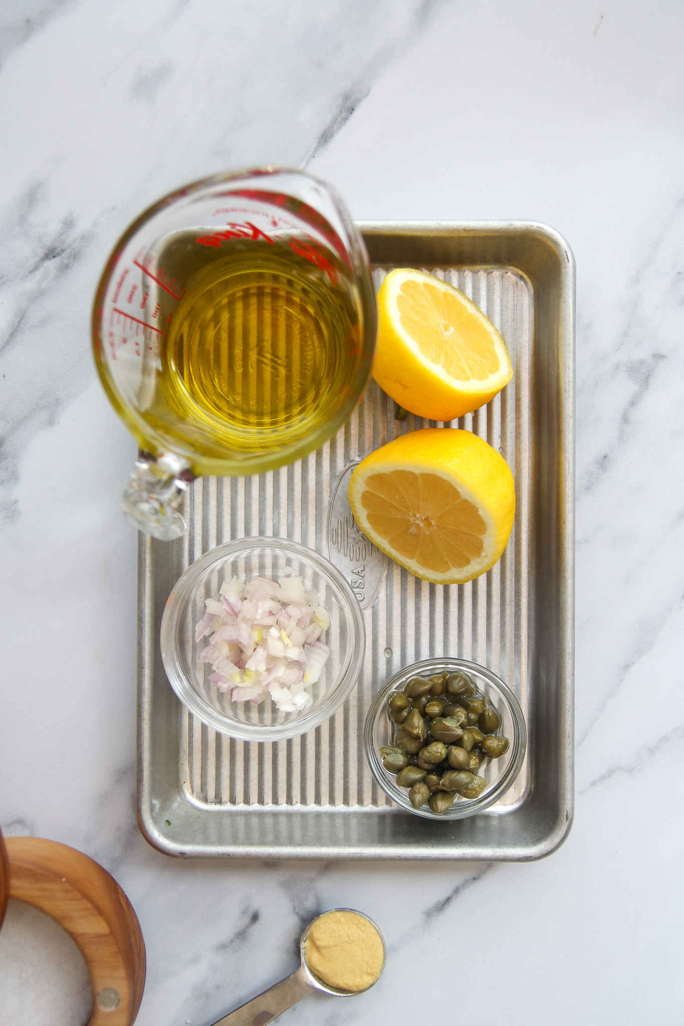 - In a jar with a tight-fitting lid, combine the olive oil, lemon juice, minced capers, minced shallot, and Dijon mustard. Screw the lid on tightly and shake well. Taste, then season to your liking with sea salt and freshly cracked black pepper. Shake again.