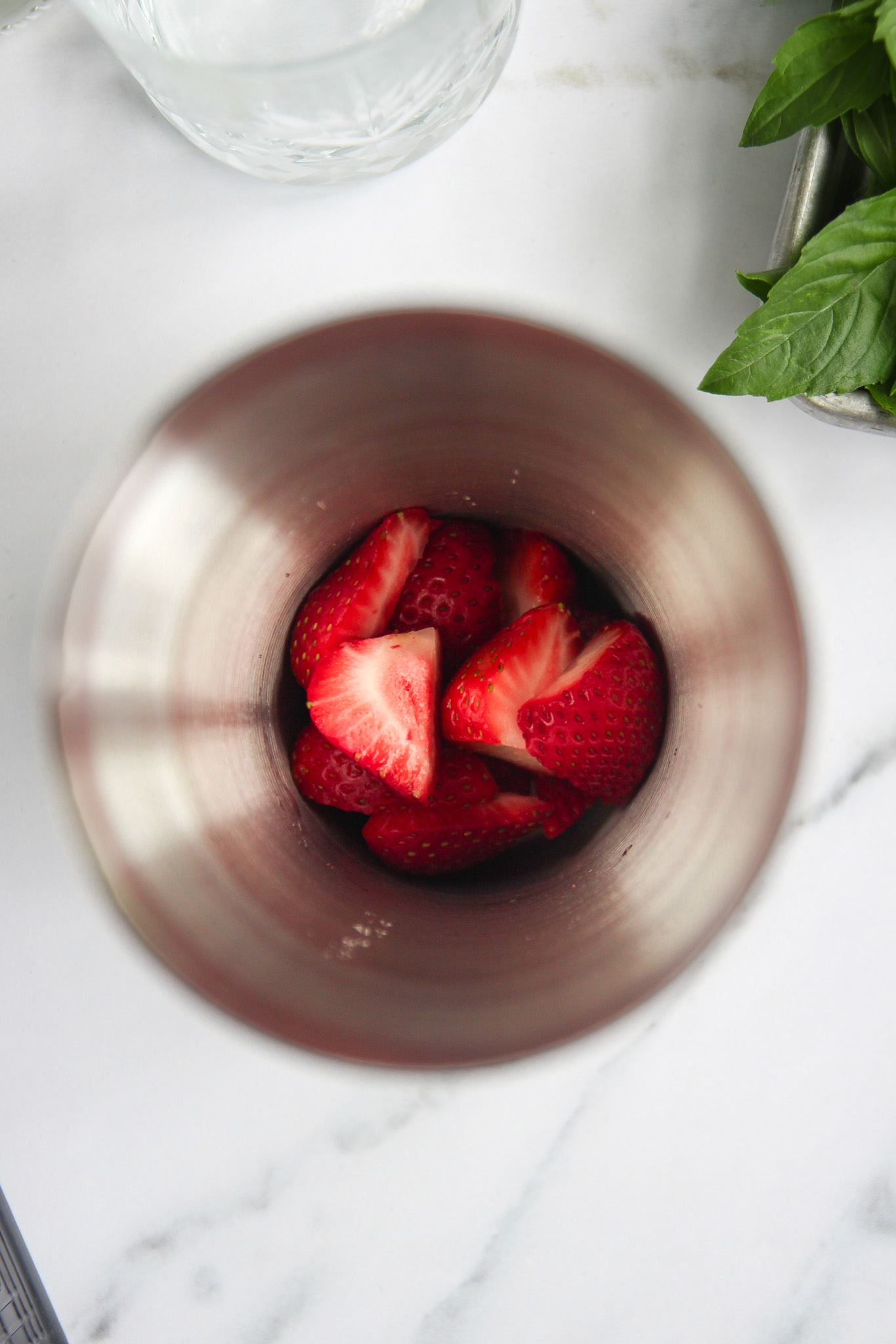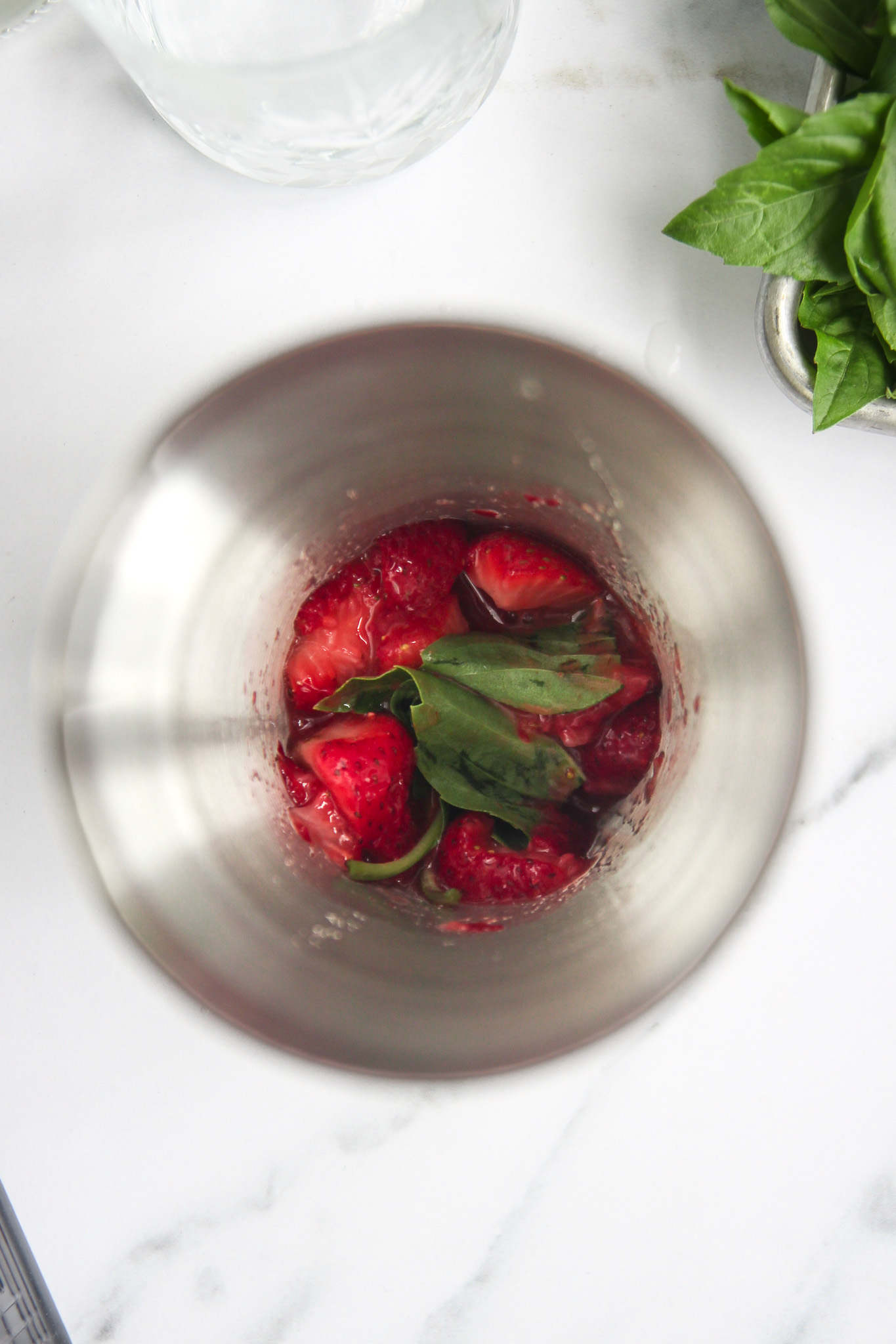 Add the fresh strawberries and basil leaves to a cocktail shaker. Using a cocktail muddler, muddle the berries and basil together to release their juices. Add ice to the shaker with the muddled berries.