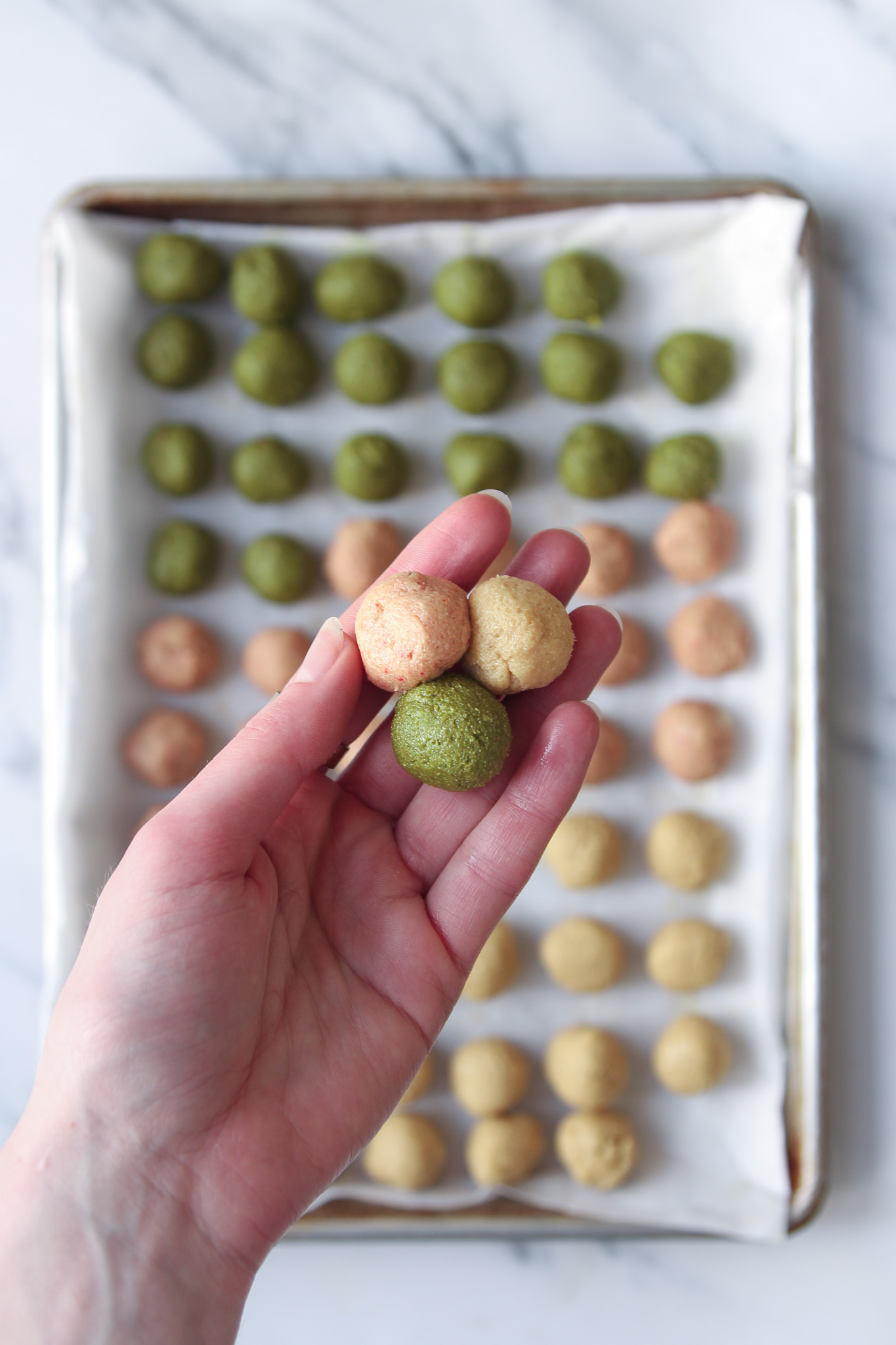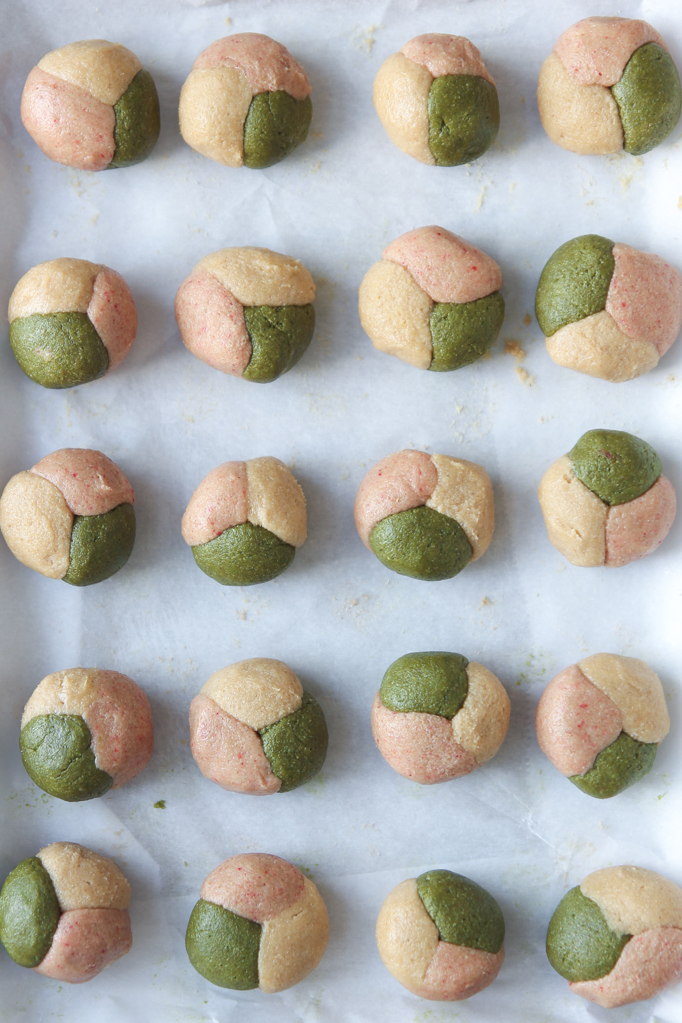 - Line a small baking tray with parchment. Starting with the plain dough, use a teaspoon to portion the dough into 20 little balls, placing each ball on the lined baking sheet as you roll them. Repeat with the strawberry dough, and lastly the matcha dough. I keep a glass of warm water on the counter to dip the teaspoon into as needed to prevent the dough from sticking.