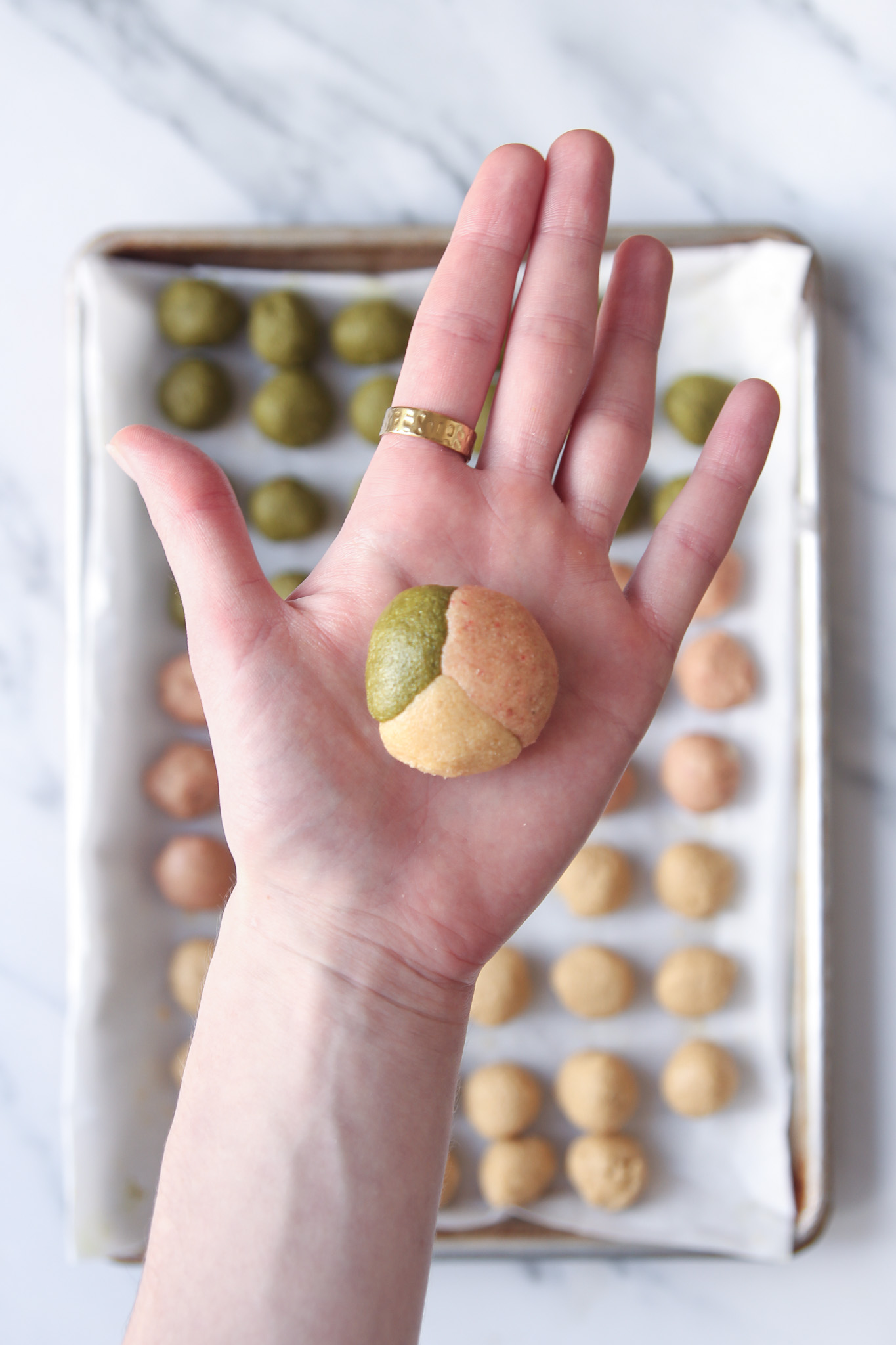 - To form one cookie, take one portion each of plain, strawberry, and matcha dough in your hand. Gently press the dough together and roll into a singular ball of dough. You want the dough to be compact, but each of the flavours should still be visible. See the photos above for a visual. Repeat with the remaining dough.