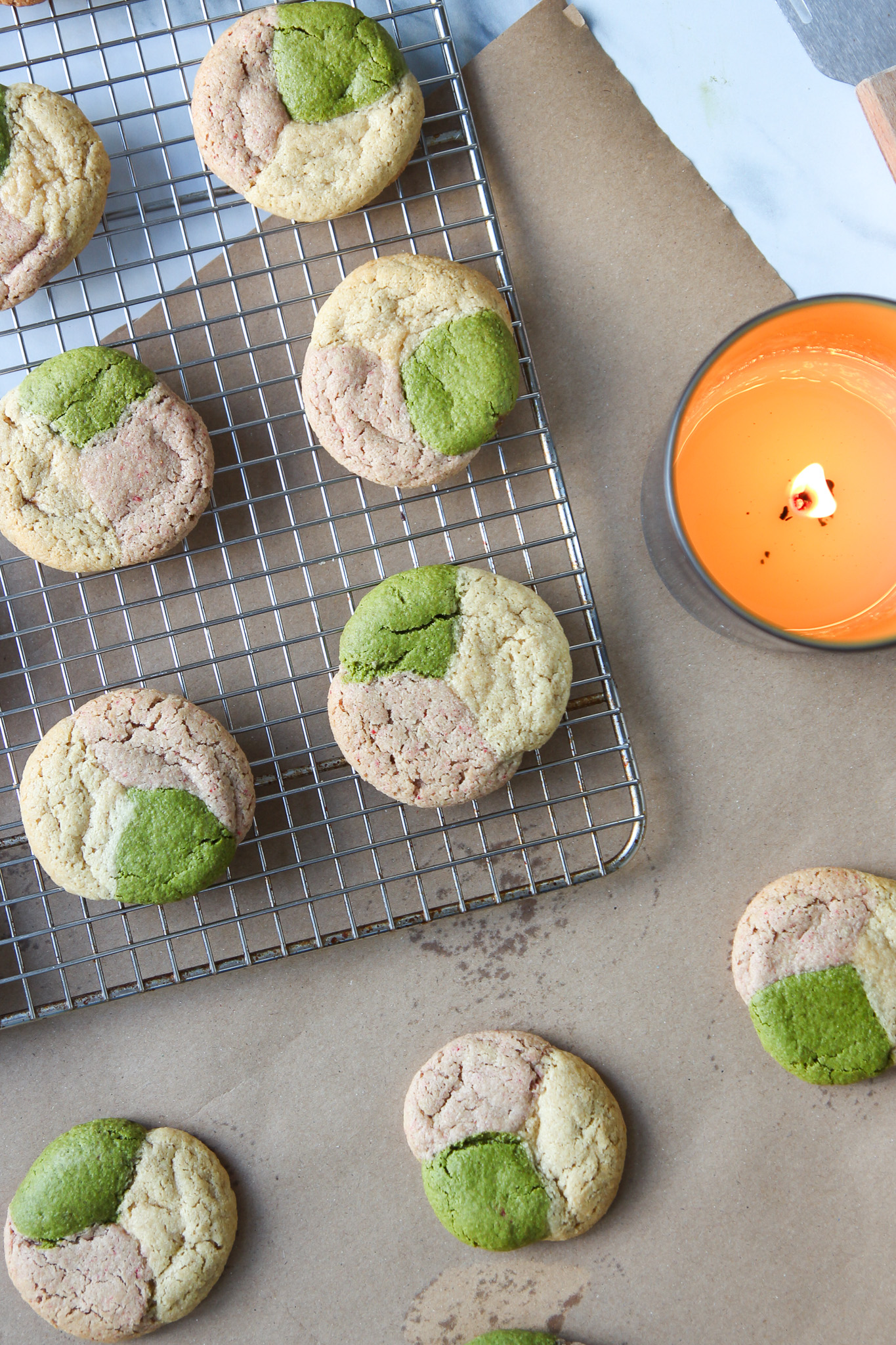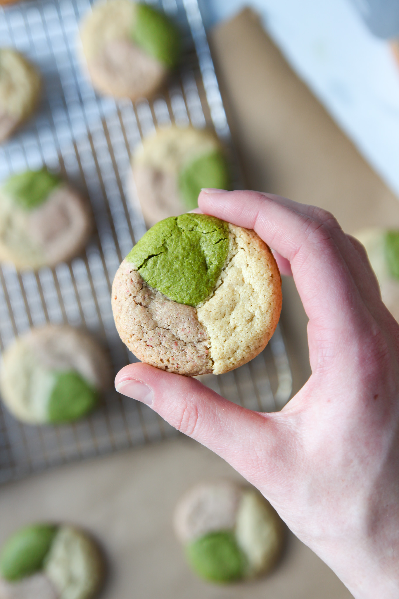 To form one cookie, take one portion each of plain, strawberry, and matcha dough in your hand. Gently press the dough together and roll into a singular ball of dough. You want the dough to be compact, but each of the flavours should still be visible. See the photos above for a visual. Repeat with the remaining dough.