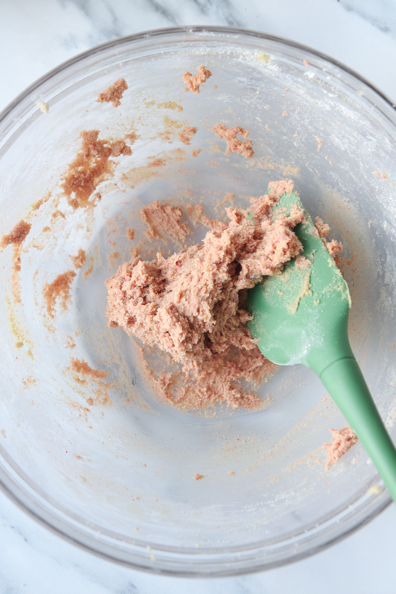 - Add the strawberry powder to the dough in the stand mixer. Beat on medium until fully incorporated. Scrape the strawberry dough out of the mixer's bowl into a clean bowl.