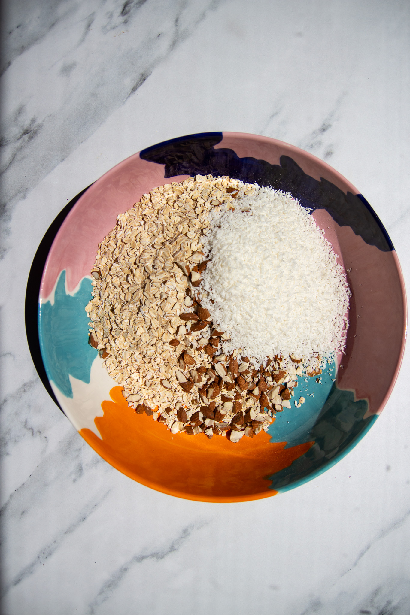 - In a large bowl, combine the oats, coconut, flax seeds, almonds, salt, cinnamon, and cardamom. Mix well.