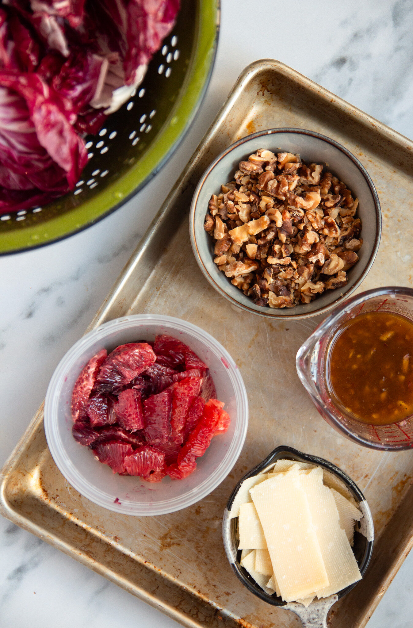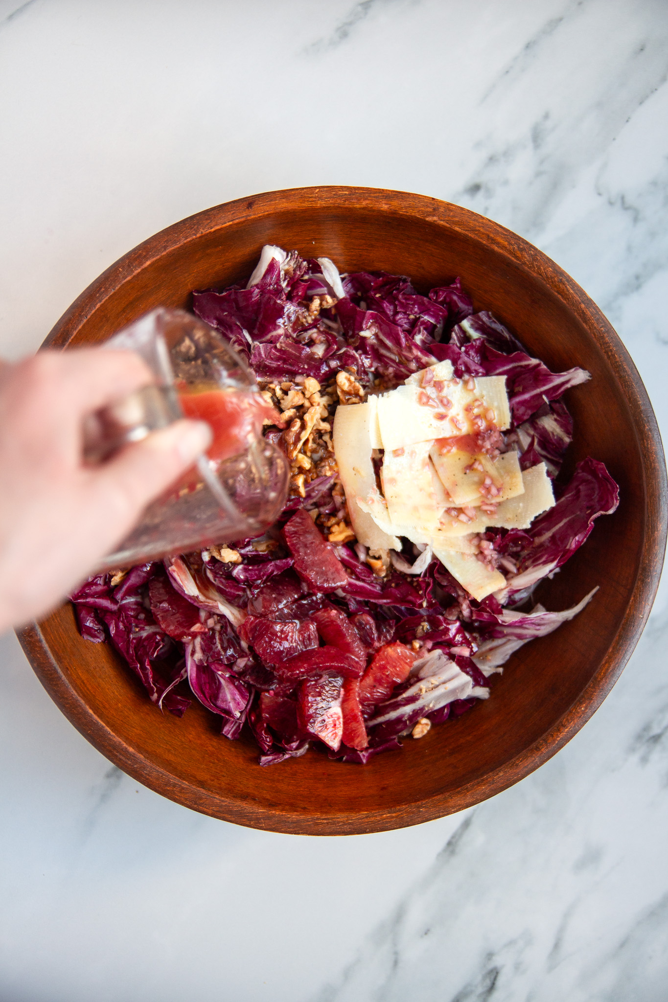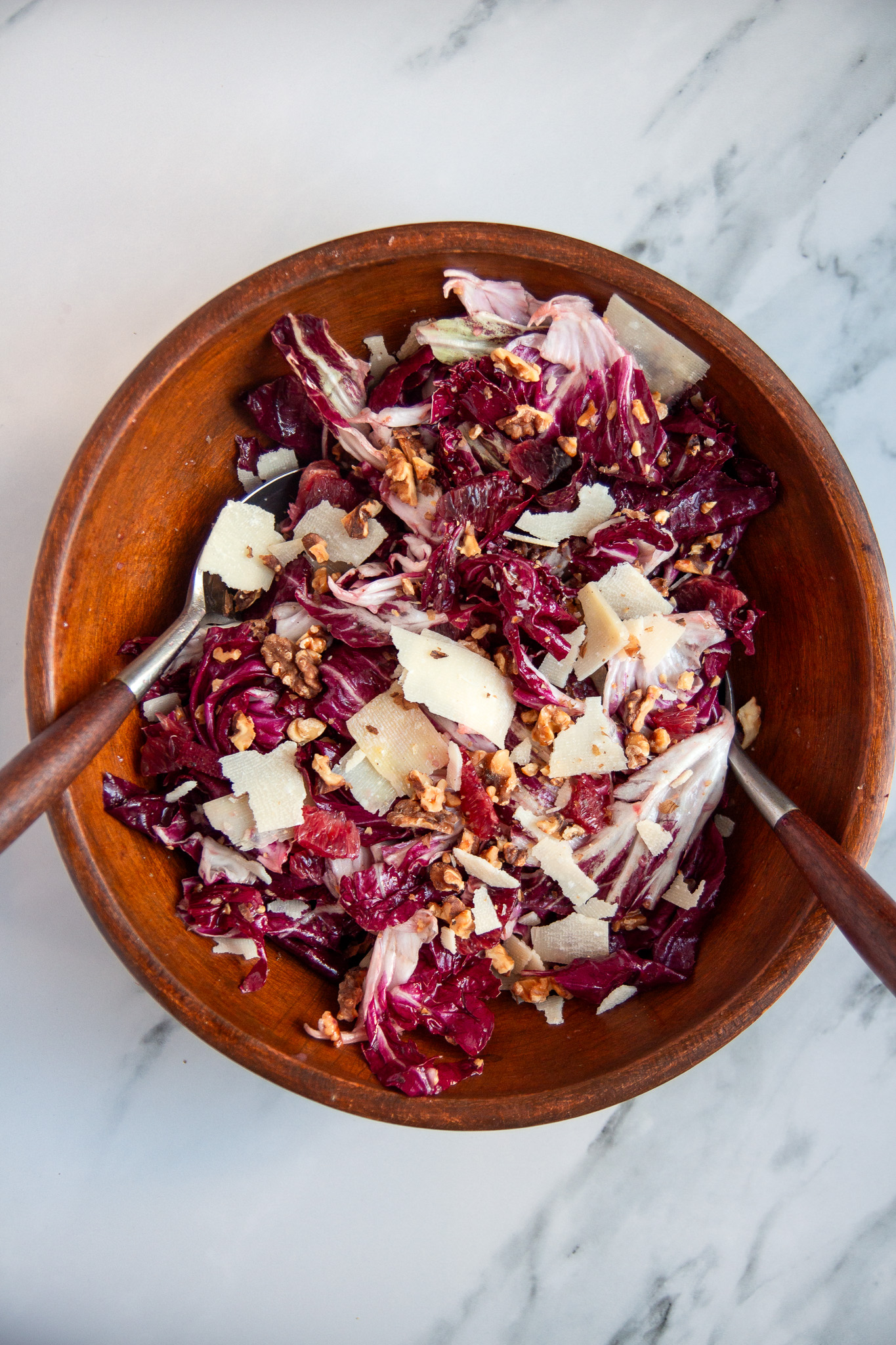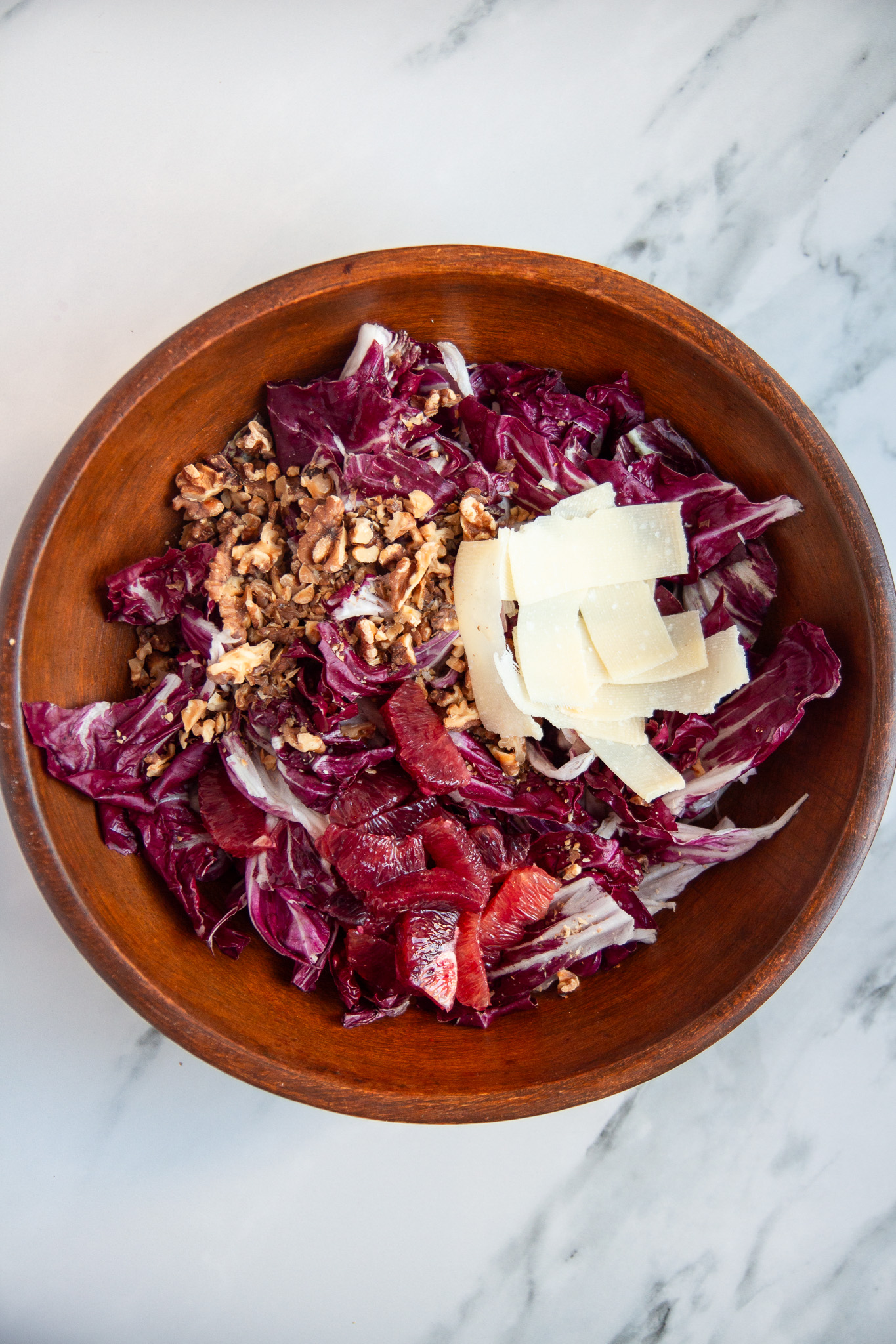 - Wash and dry the radicchio, then tear the leaves into a large salad bowl. Roughly chop the toasted walnuts and add to the salad bowl along with the blood orange segments and shaved parmesan cheese. I like to reserve a small amount of the walnuts, cheese, and oranges to add on top of the salad after it's been tossed.