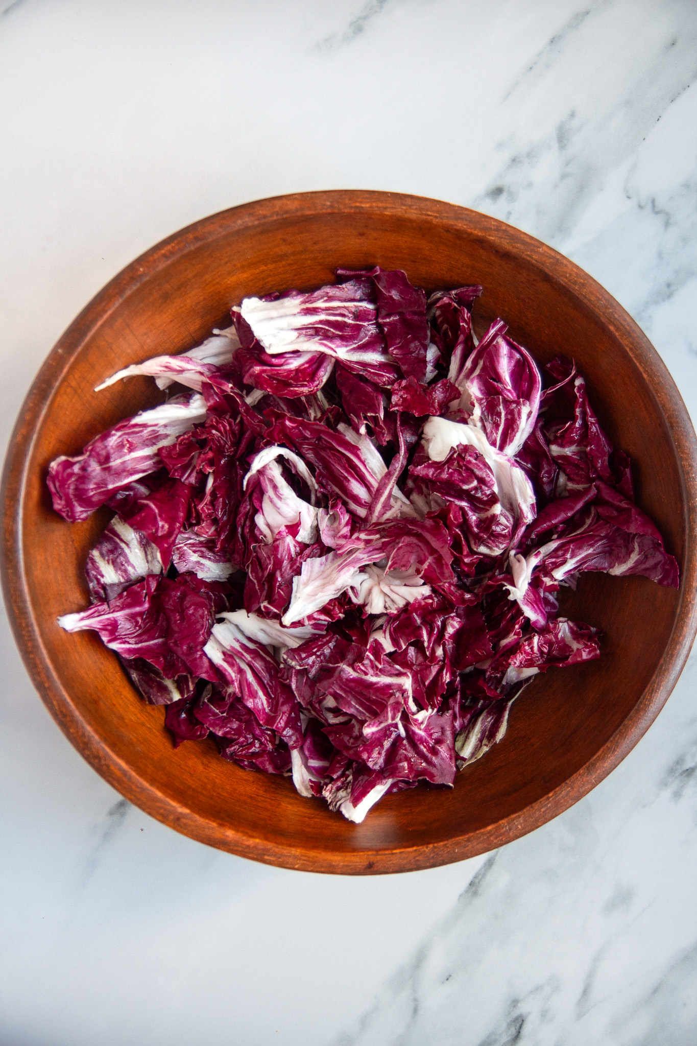 For this salad, I like to tear the radicchio leaves rather than chopping them. This method gives the salad a nice rustic feel. Tear the washed leaves into a large salad bowl and set aside.